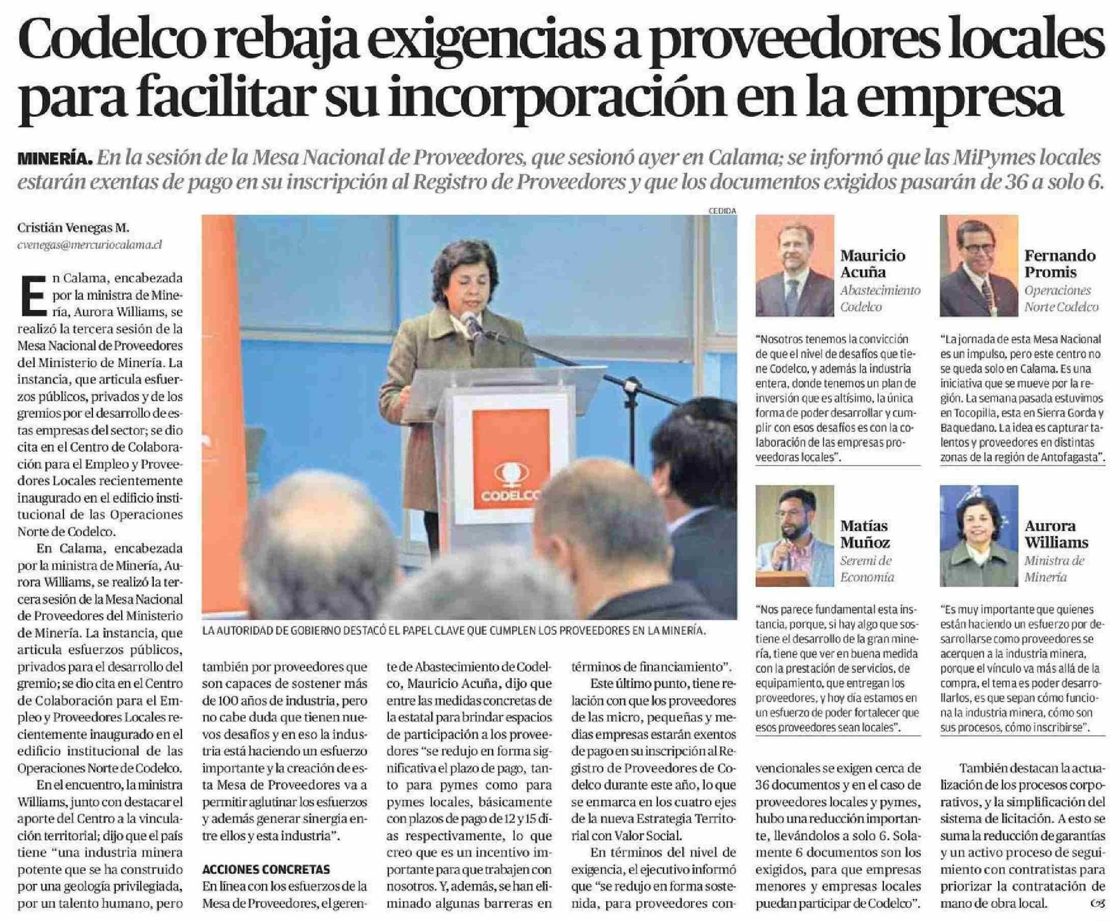 Codelco rebaja exigencias a proveedores locales para facilitar su incorporación en la empresa 12-06-2025 El Mercurio de Calama |