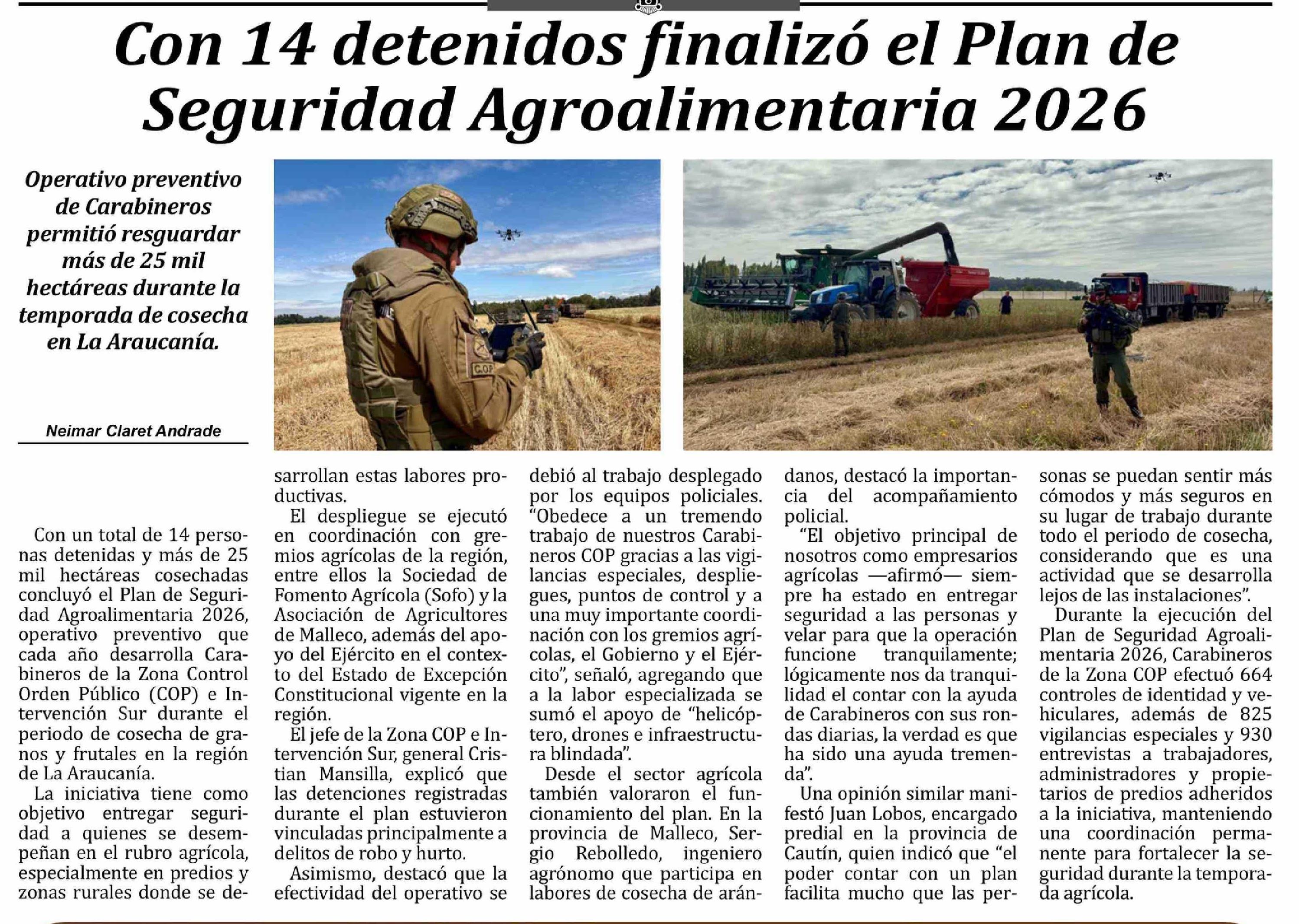 | Título: | Con 14 detenidos finalizó el Plan de Seguridad Agroalimentaria 2026 |