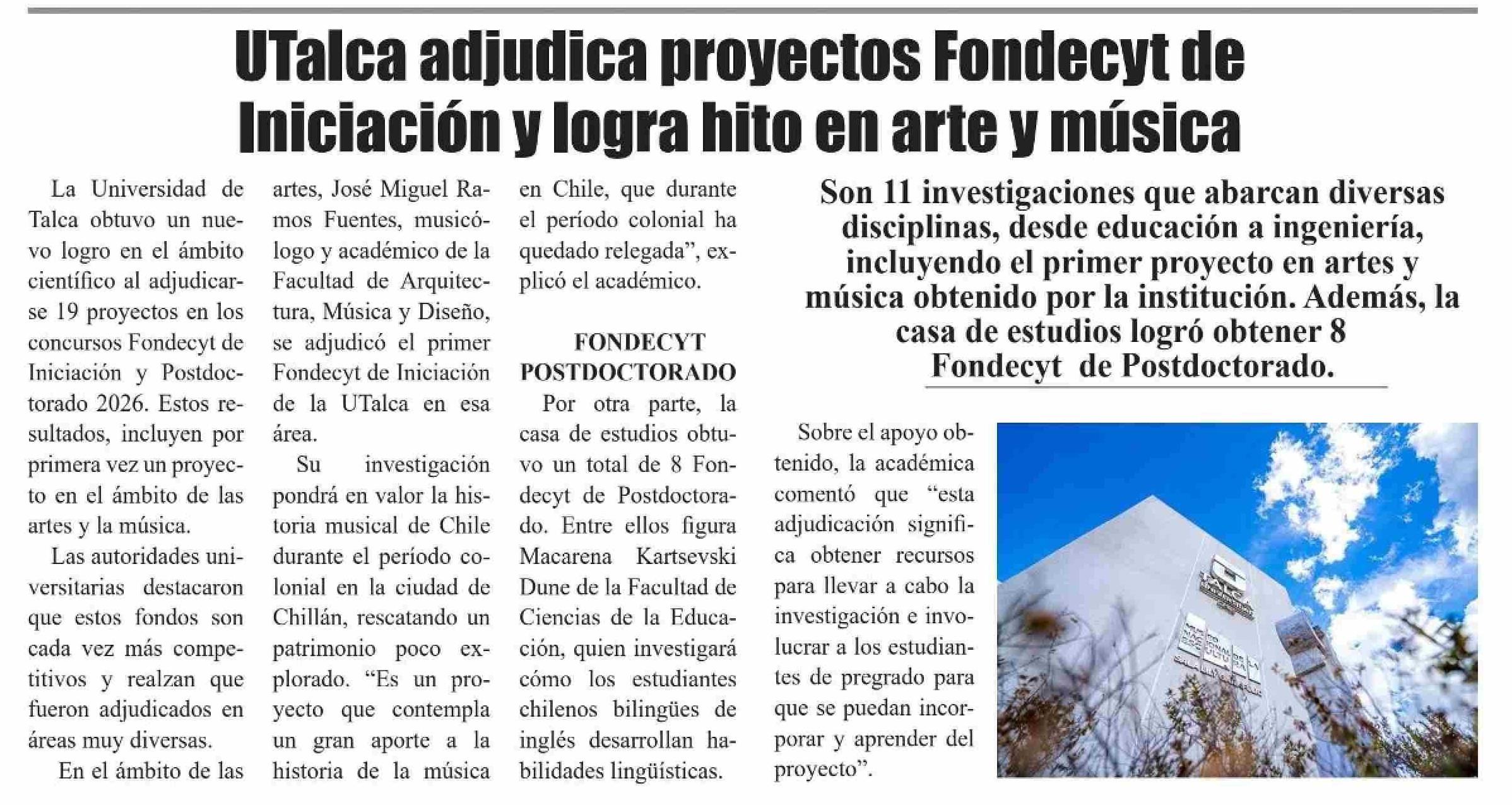 Título: UTalca adjudica proyectos Fondecyt de Iniciación y logra hito en arte y música