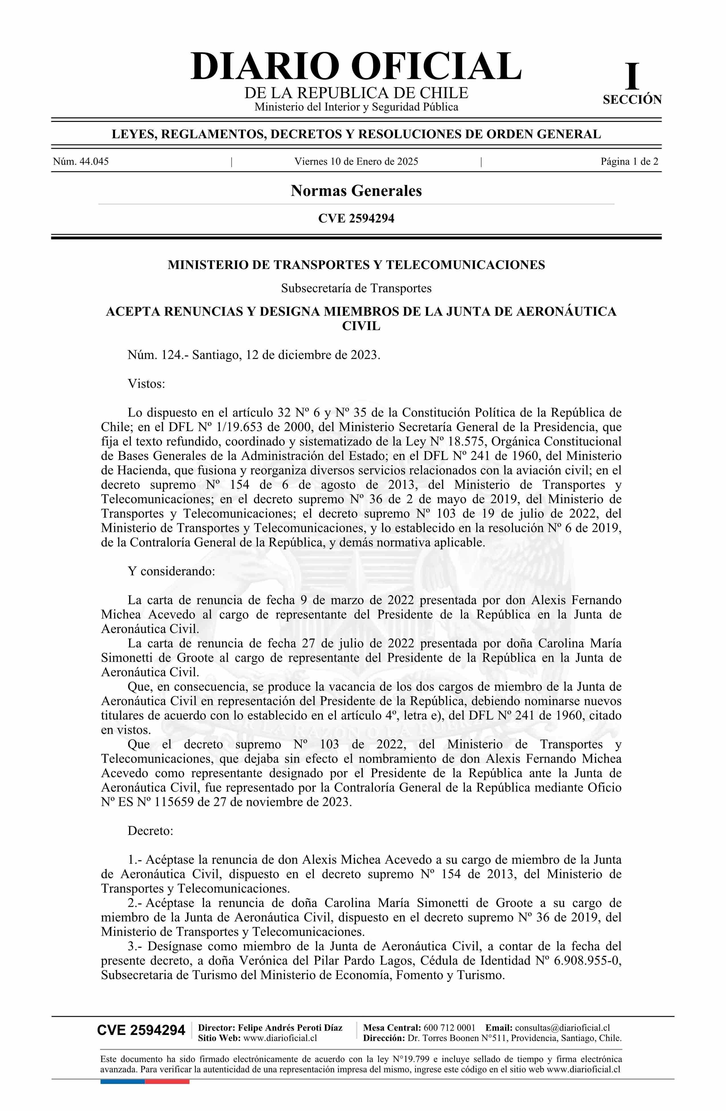 Decreto número 124, de 2023.- Acepta renuncias y designa miembros de la Junta de Aeronáutica Civil 10-01-2025 DIARIO OFICIAL CHILE - BOLETÍN OFICIAL DE MINERÍA |
