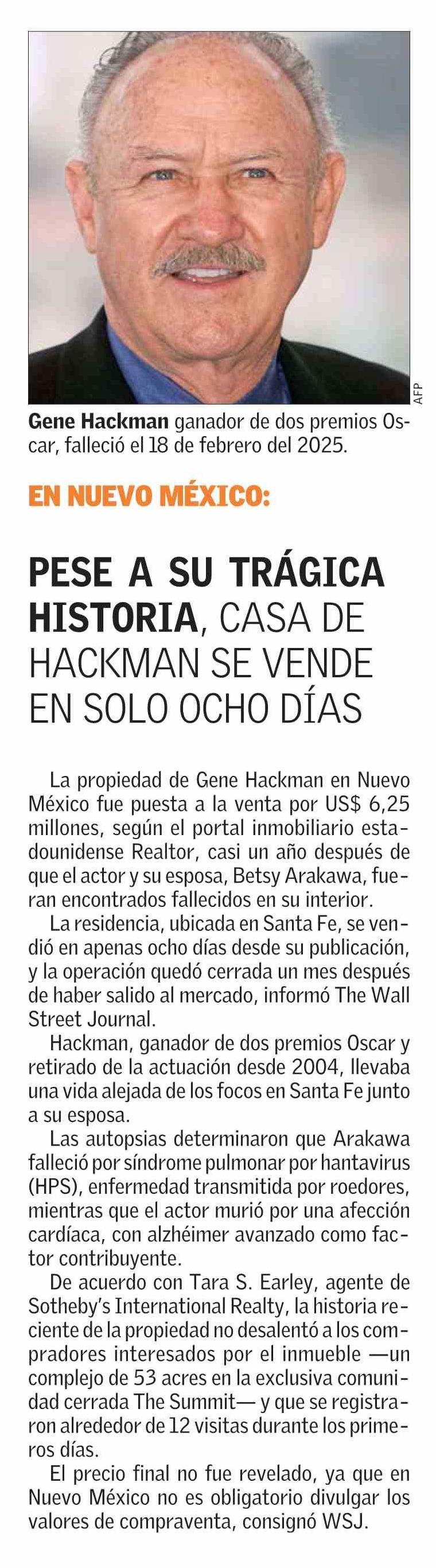 Título: PESE A SU TRÁGICA HISTORIA, CASA DE HACKMAN SE VENDE EN SOLO OCHO DÍAS