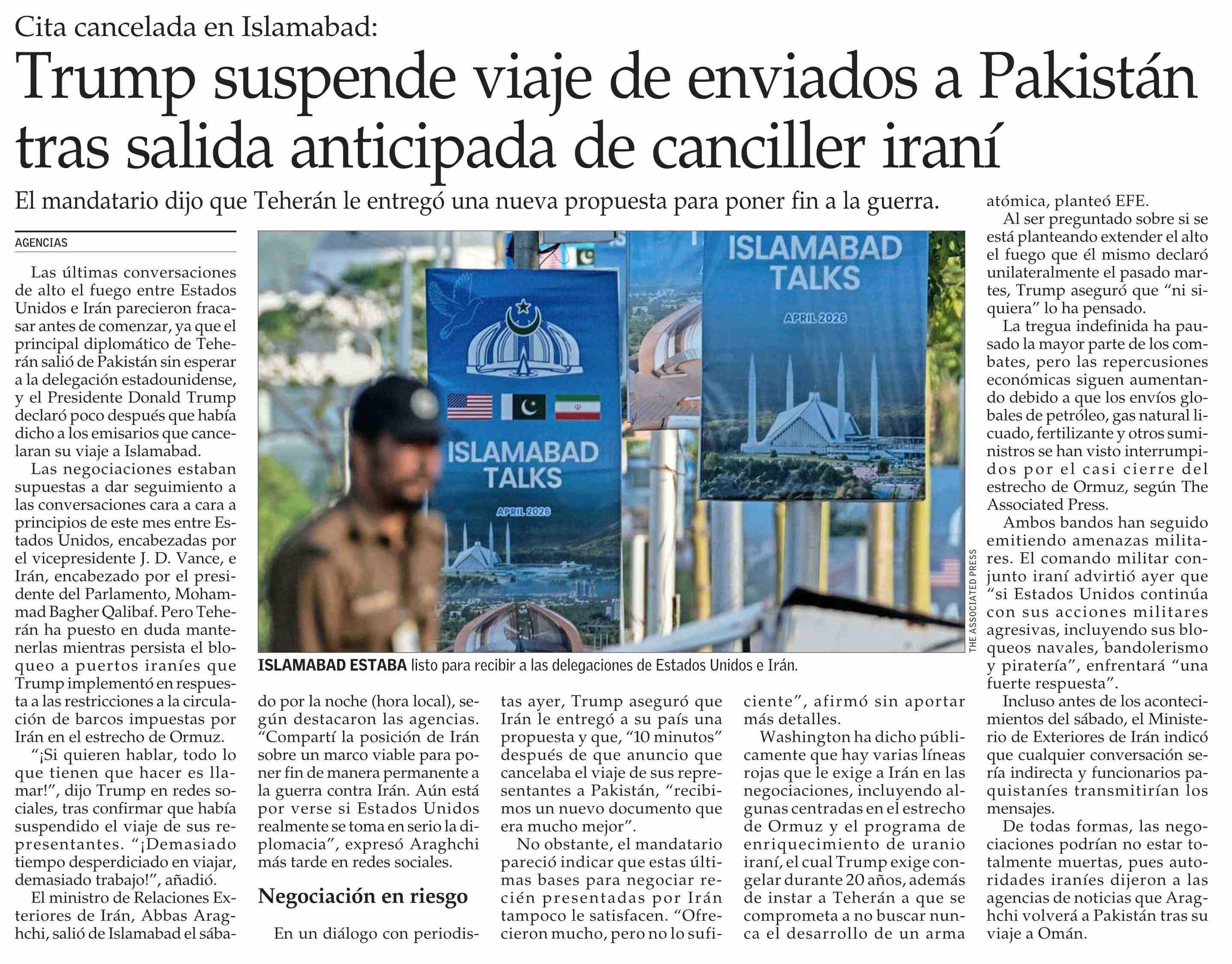 | Título: | Trump suspende viaje de enviados a Pakistán tras salida anticipada de canciller iraní |