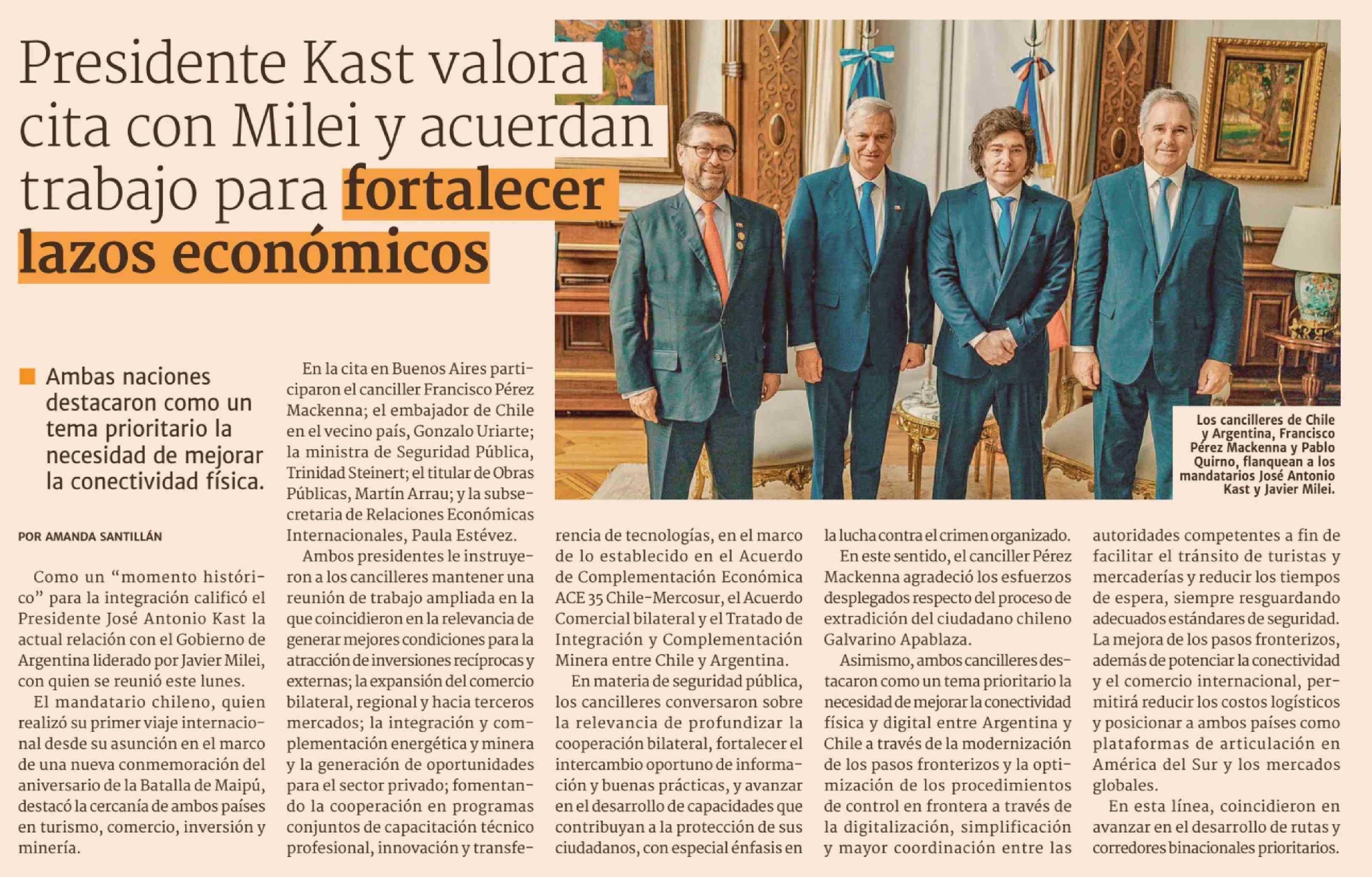 Presidente Kast valora cita con Milei y acuerdan trabajo para fortalecer lazos económicos 07-04-2026 Diario Financiero |