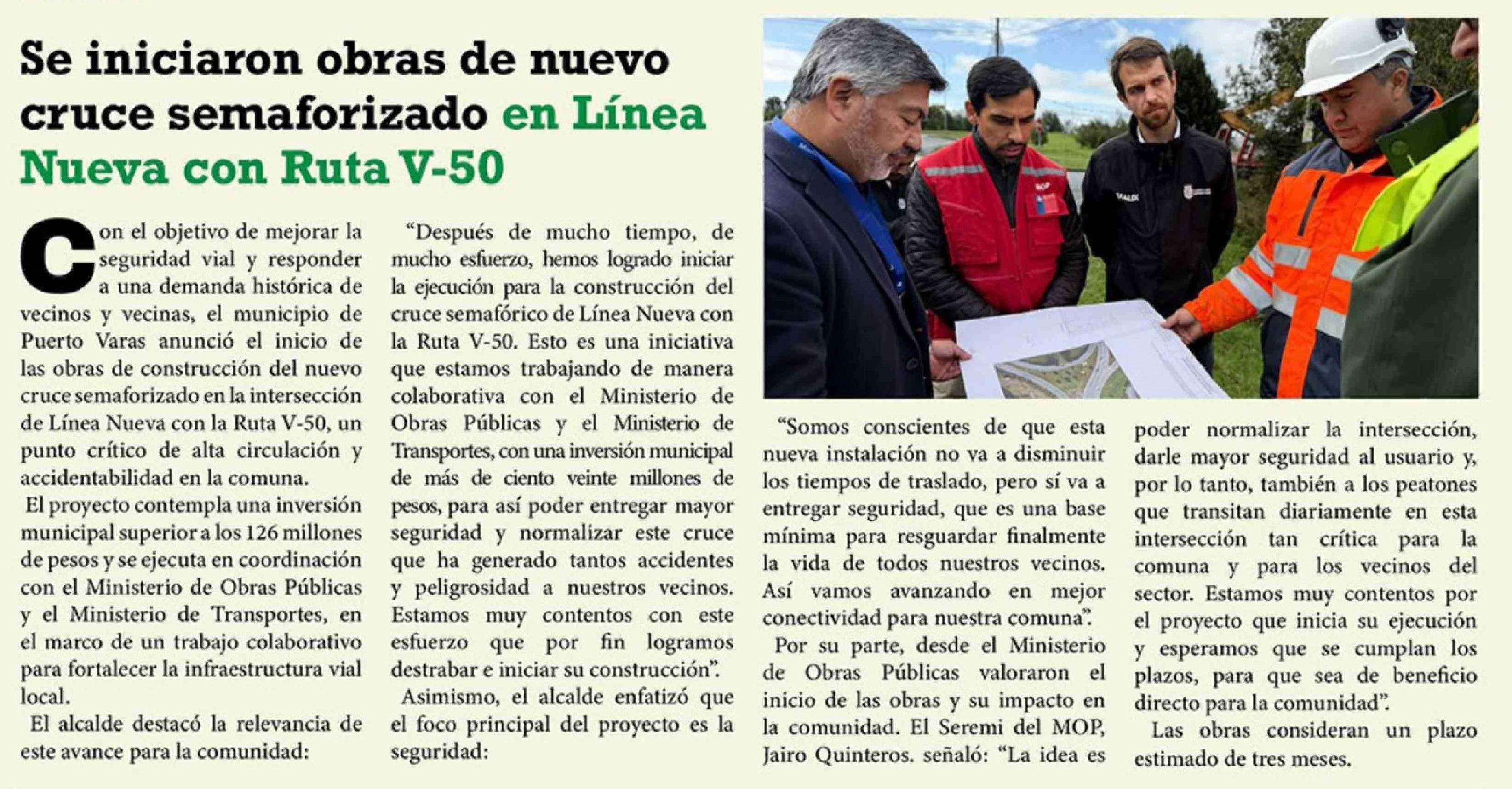 | Título: | Se iniciaron obras de nuevo cruce semaforizado en Línea Nueva con Ruta V-50 |