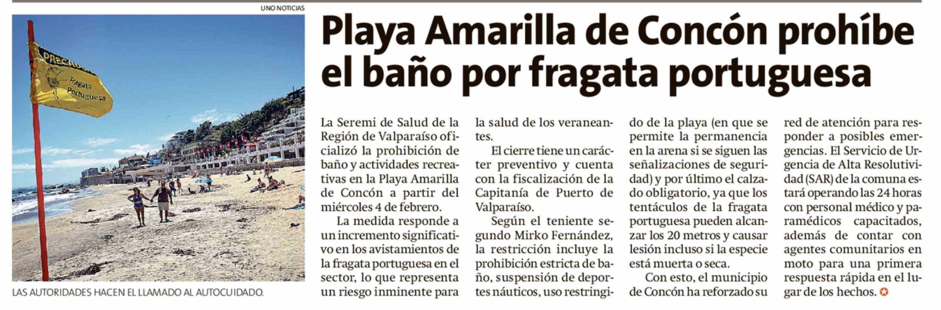 | Título: | Playa Amarilla de Concón prohíbe el baño por fragata portuguesa |