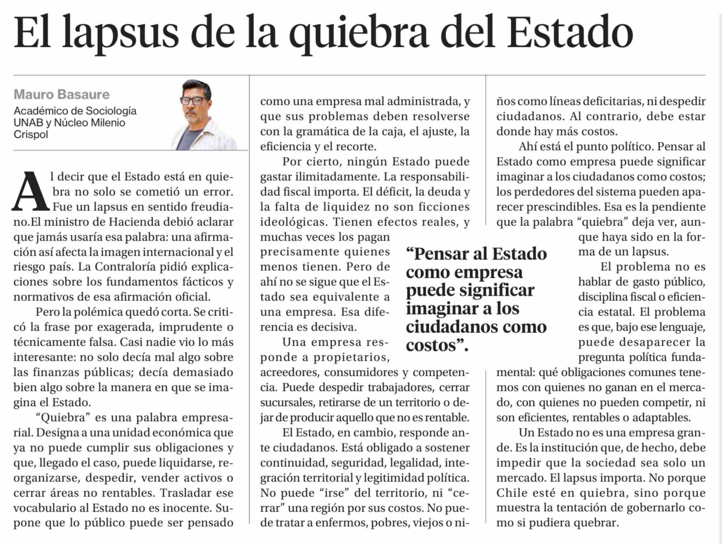 Título: Columnas de Opinión: El lapsus de la quiebra del Estado