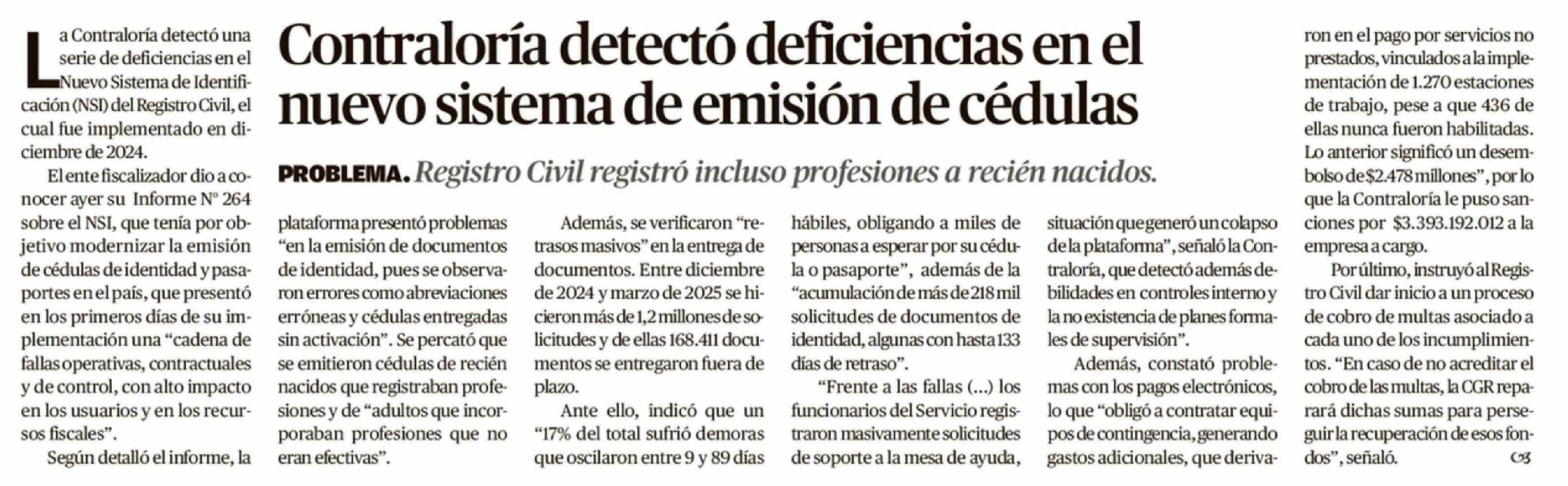 Contraloría detectó deficiencias en el nuevo sistema de emisión de cédulas 28-03-2026 El Austral de Osorno |
