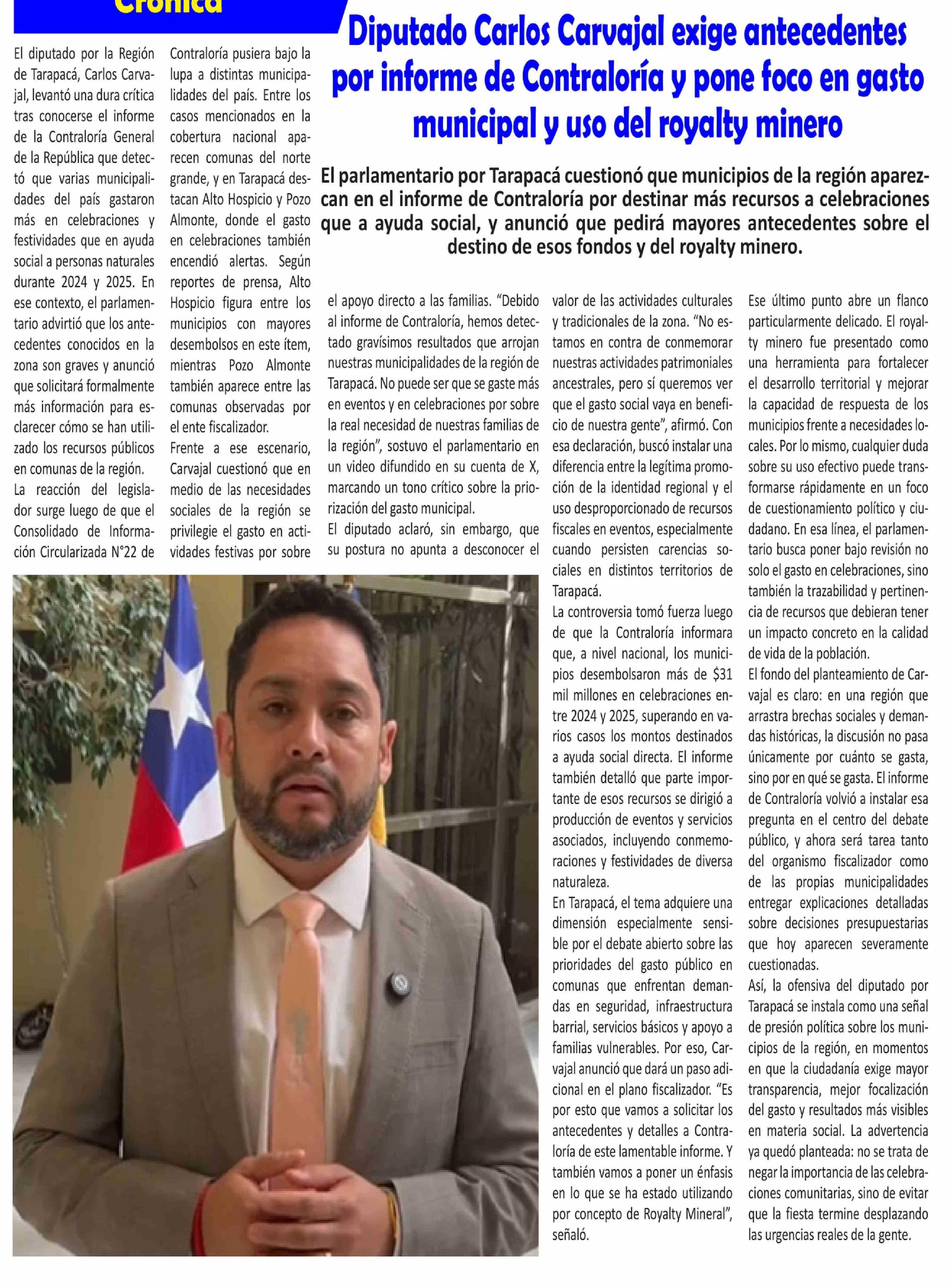 Título: Diputado Carlos Carvajal exige antecedentes por informe de Contraloría y pone foco en gasto municipal y uso del royalty minero