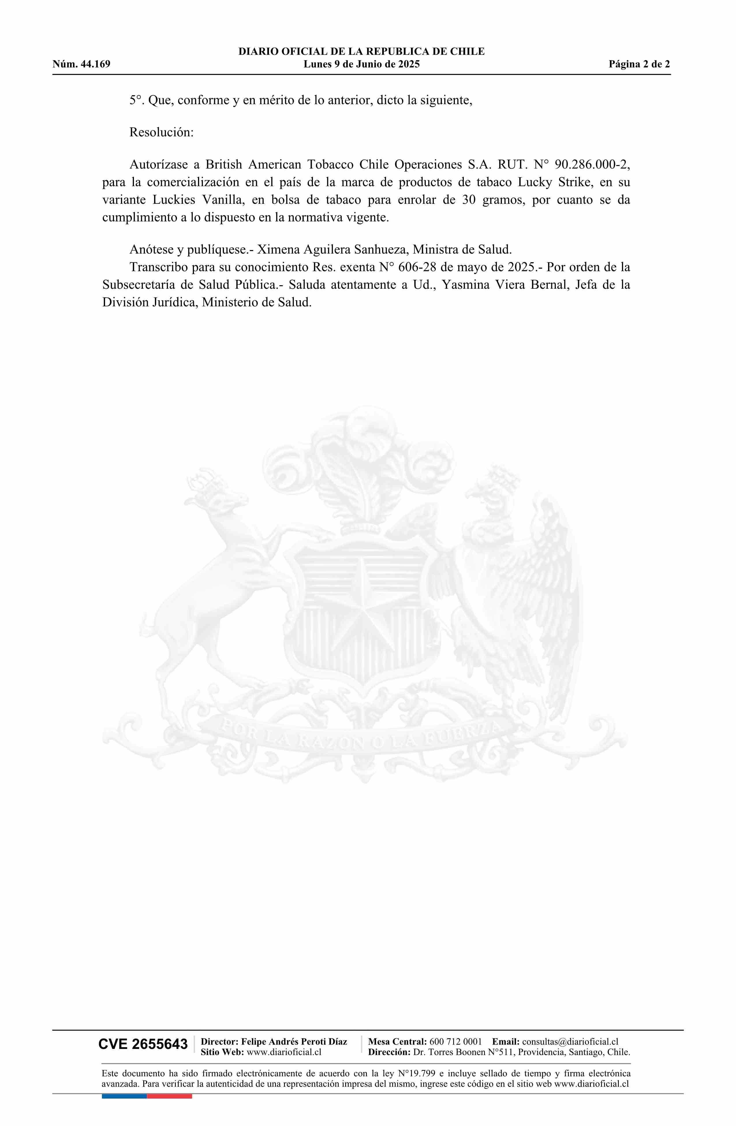 Resolución exenta número 606, de 2025.- Autoriza comercialización de productos de tabaco que indica comercializados por British American Tobacco Chile Operaciones S.A. 09-06-2025 DIARIO OFICIAL CHILE - BOLETÍN OFICIAL DE MINERÍA |