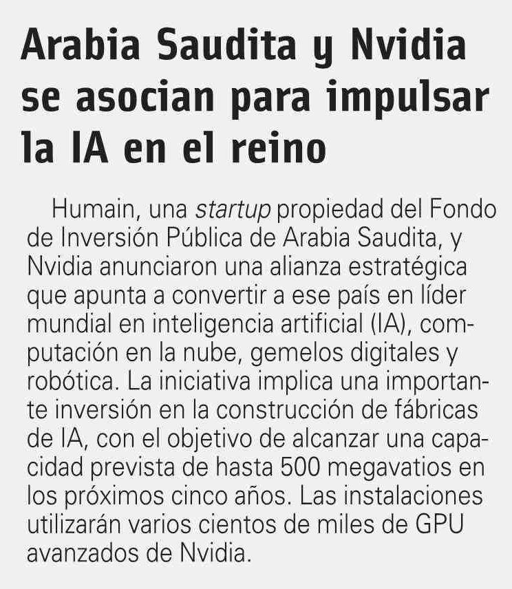 Arabia Saudita y Nvidia se asocian para impulsar la IA en el reino 28-05-2025 El Mercurio |