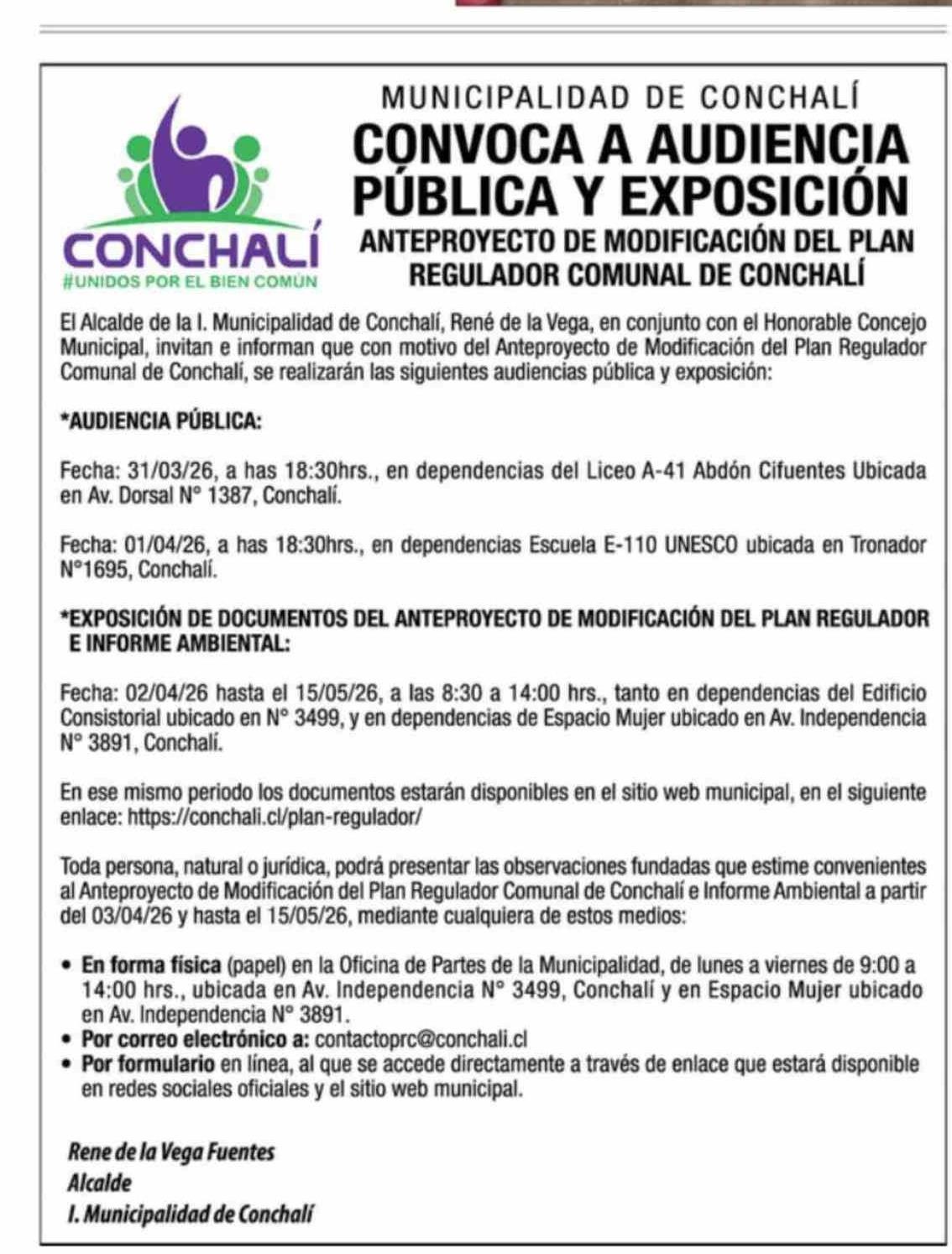 EXTRACTOS: MUNICIPALIDAD DE CONCHALÍ CONVOCA A AUDIENCIA PÚBLICA Y EXPOSICIÓN Í ANTEPROYECTO DE MODIFICACIÓN DEL PLAN A REGULADOR COMUNAL DE CONCHALÍ 30-03-2026 Las Últimas Noticias |