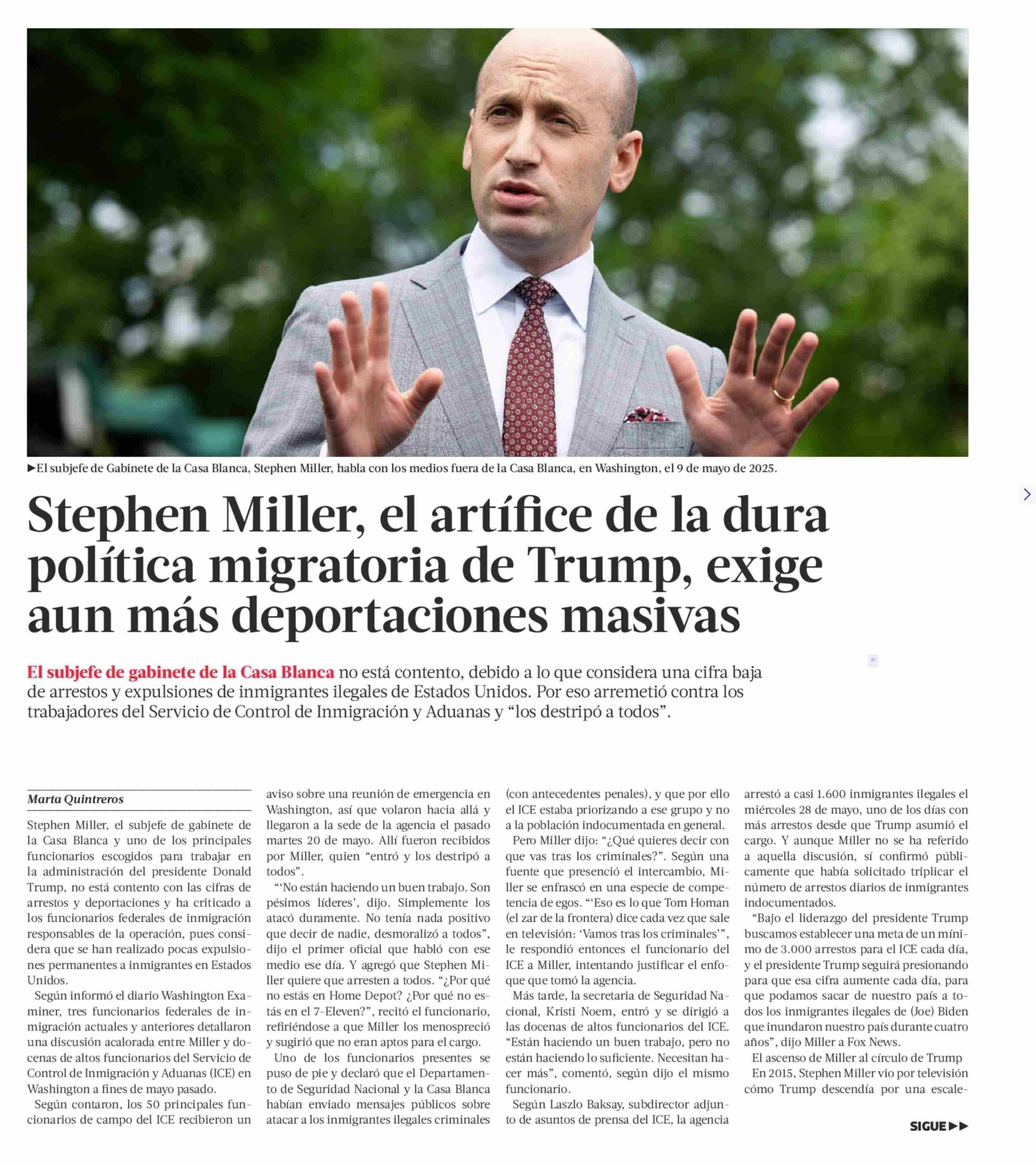 Stephen Miller, el artífice de la dura política migratoria de Trump, exige aun más deportaciones masivas 11-06-2025 La Tercera |