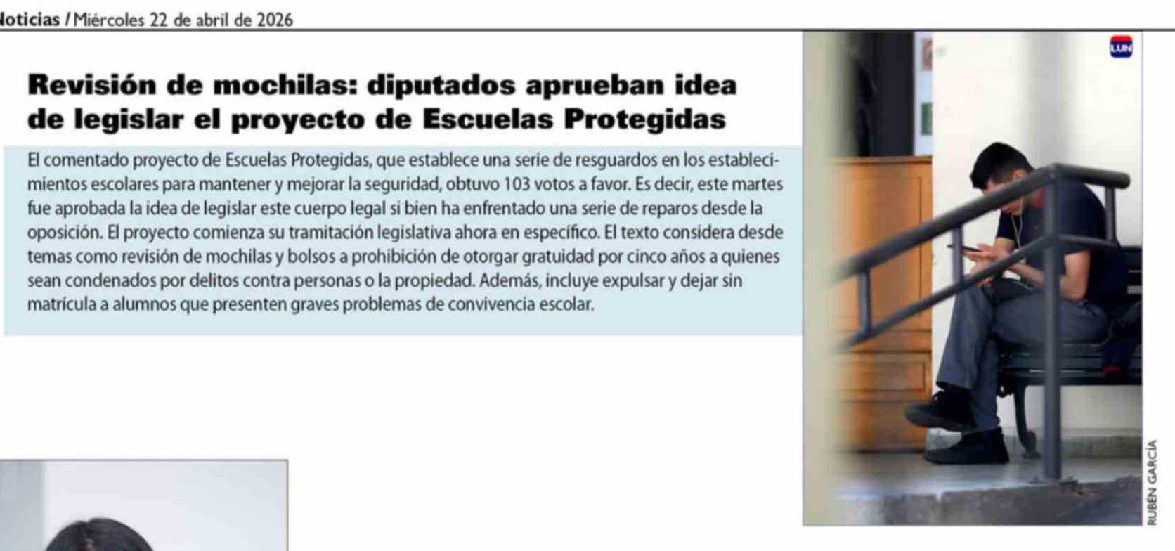 Revisión de mochilas: diputados aprueban idea de legislar el proyecto de Escuelas Protegidas 22-04-2026 Las Últimas Noticias |