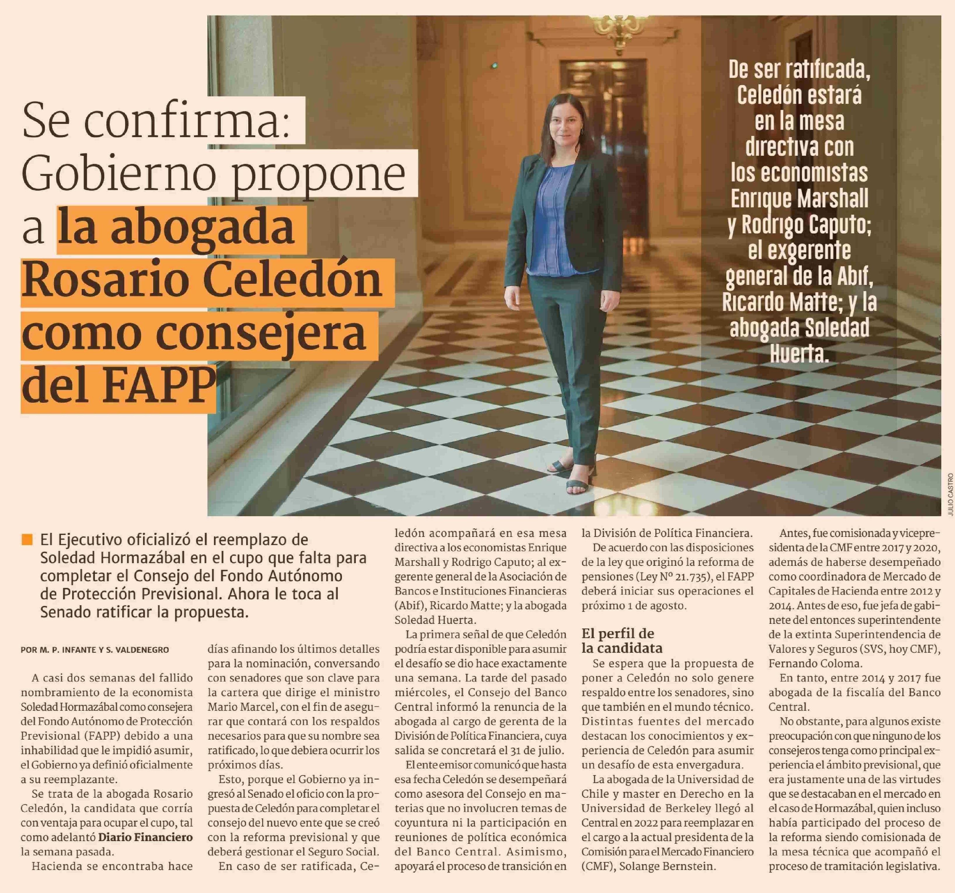 Se confirma: Gobierno propone a la abogada Rosario Celedón como consejera del FAPP 19-06-2025 Diario Financiero |