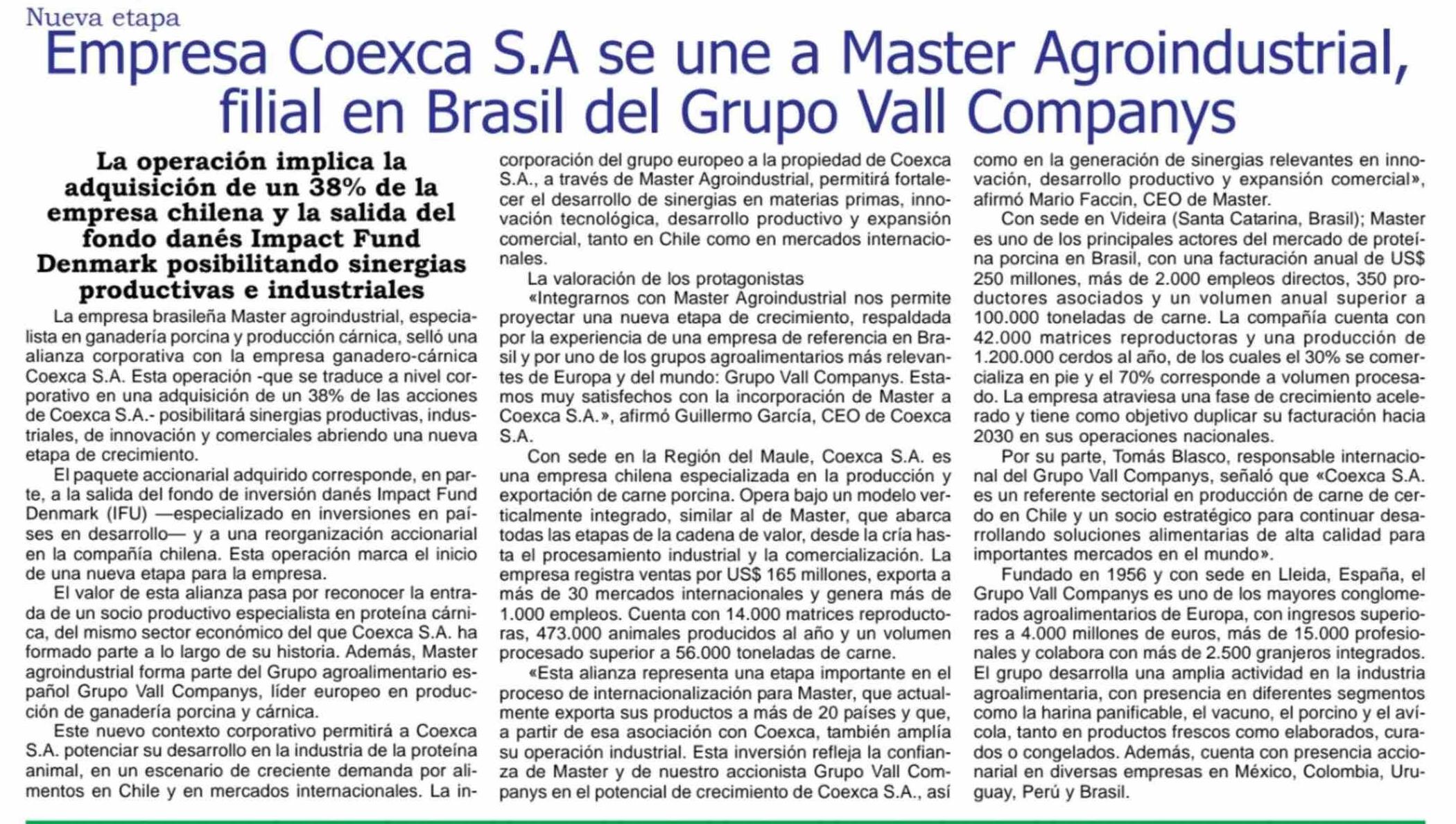 Empresa Coexca S.A se une a Master Agroindustrial, filial en Brasil del Grupo Vall Companys 16-04-2026 Maule Hoy |