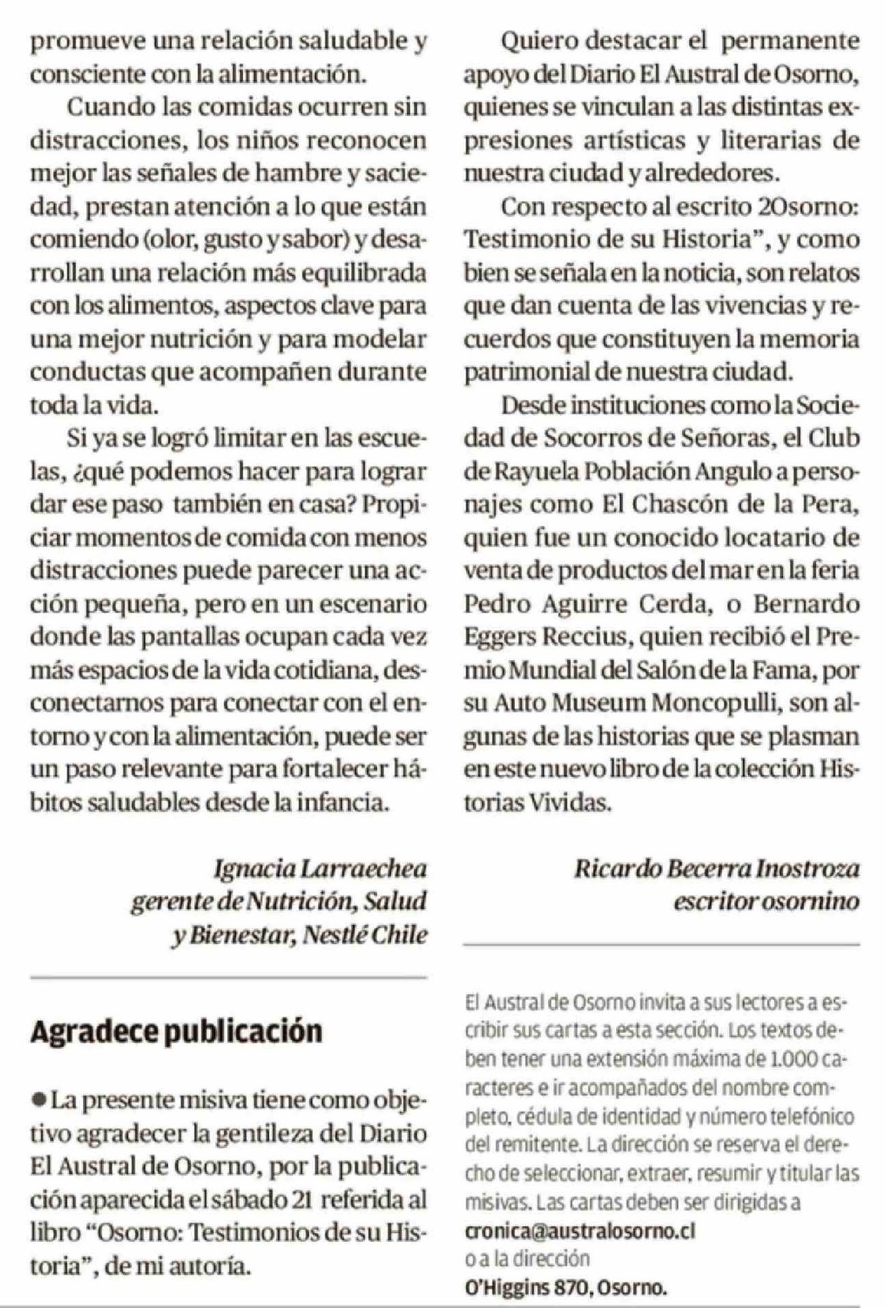 Cartas: Agradece publicación 23-03-2026 El Austral de Osorno |