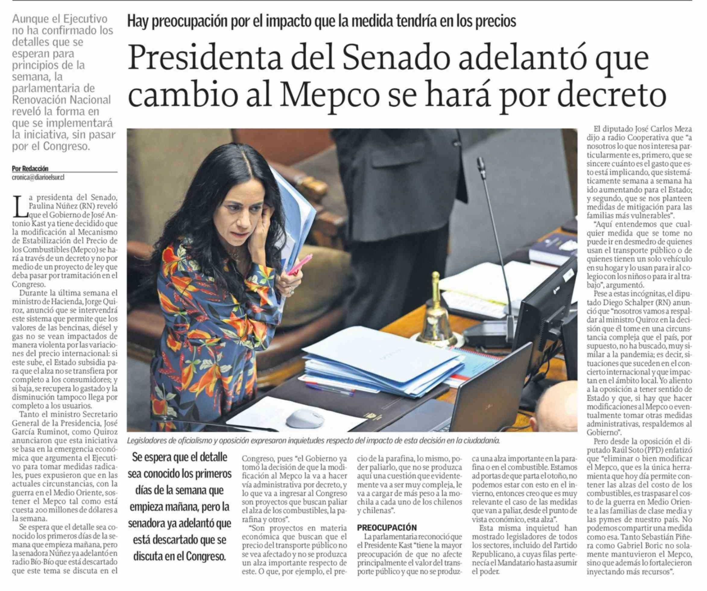 Presidenta del Senado adelantó que cambio al Mepco se hará por decreto 22-03-2026 El Sur |