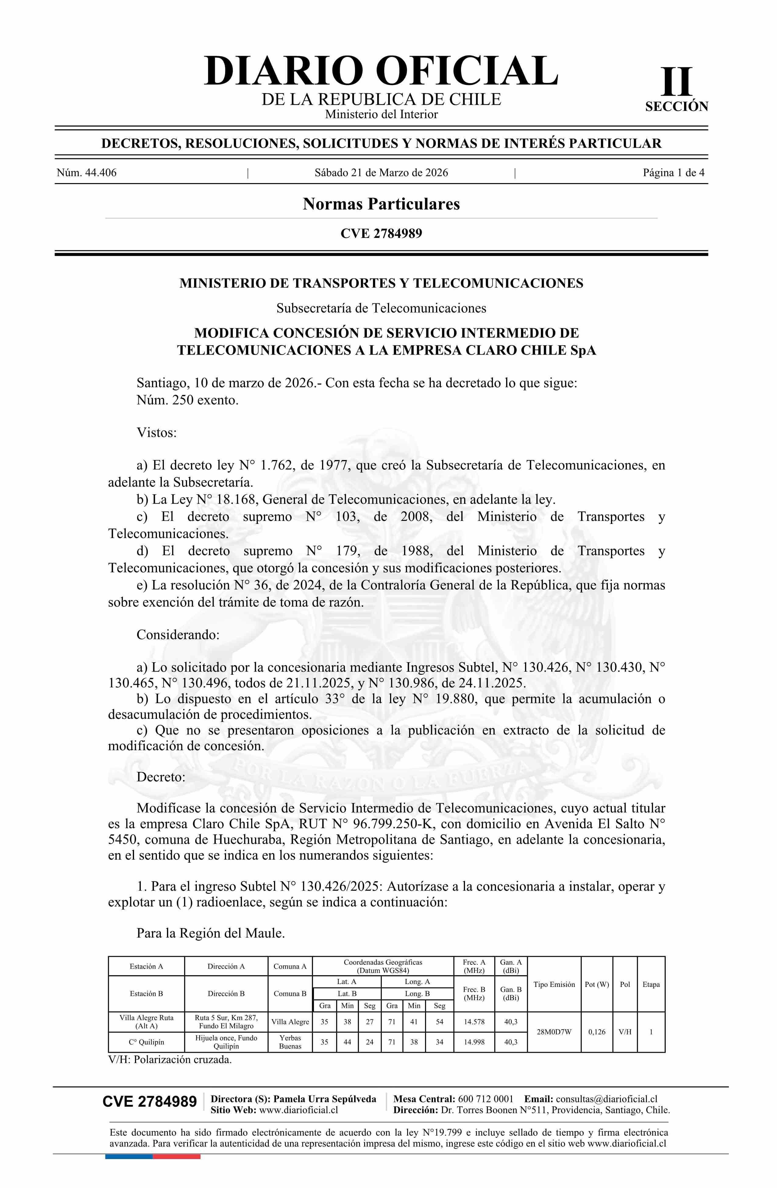 Decreto exento número 250, de 2026.- Modifica concesión de servicio intermedio de telecomunicaciones a la empresa Claro Chile SpA 21-03-2026 Diario Oficial Edición Electrónica |