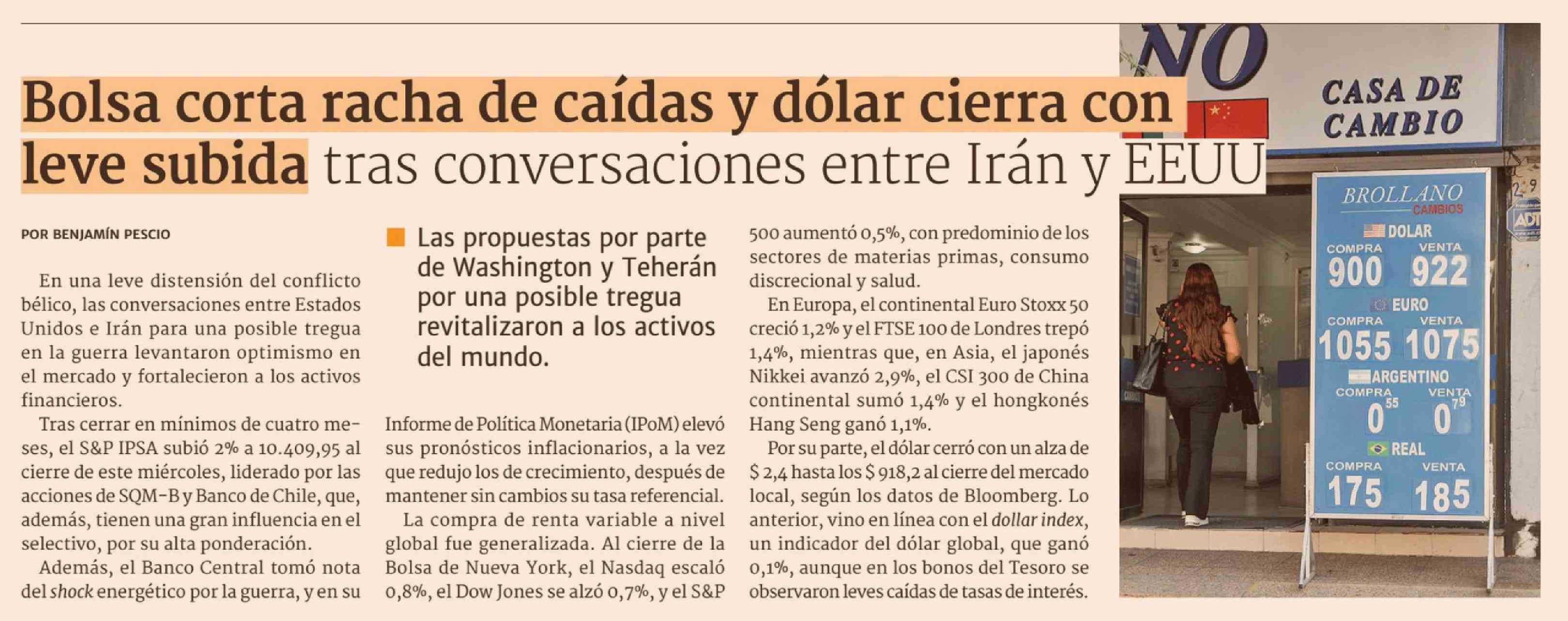 Título: Bolsa corta racha de caídas y dólar cierra con leve subida tras conversaciones entre Irán y EEUU