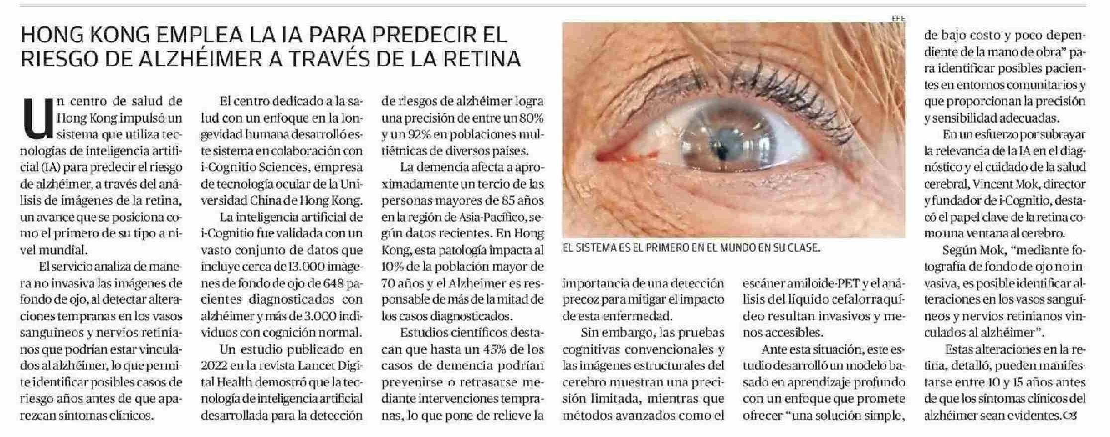 HONG KONG EMPLEA LAIA PARA PREDECIR EL RIESGO DE ALZHEIMER A TRAVÉS DE LA RETINA 08-06-2025 El Diario de Atacama |