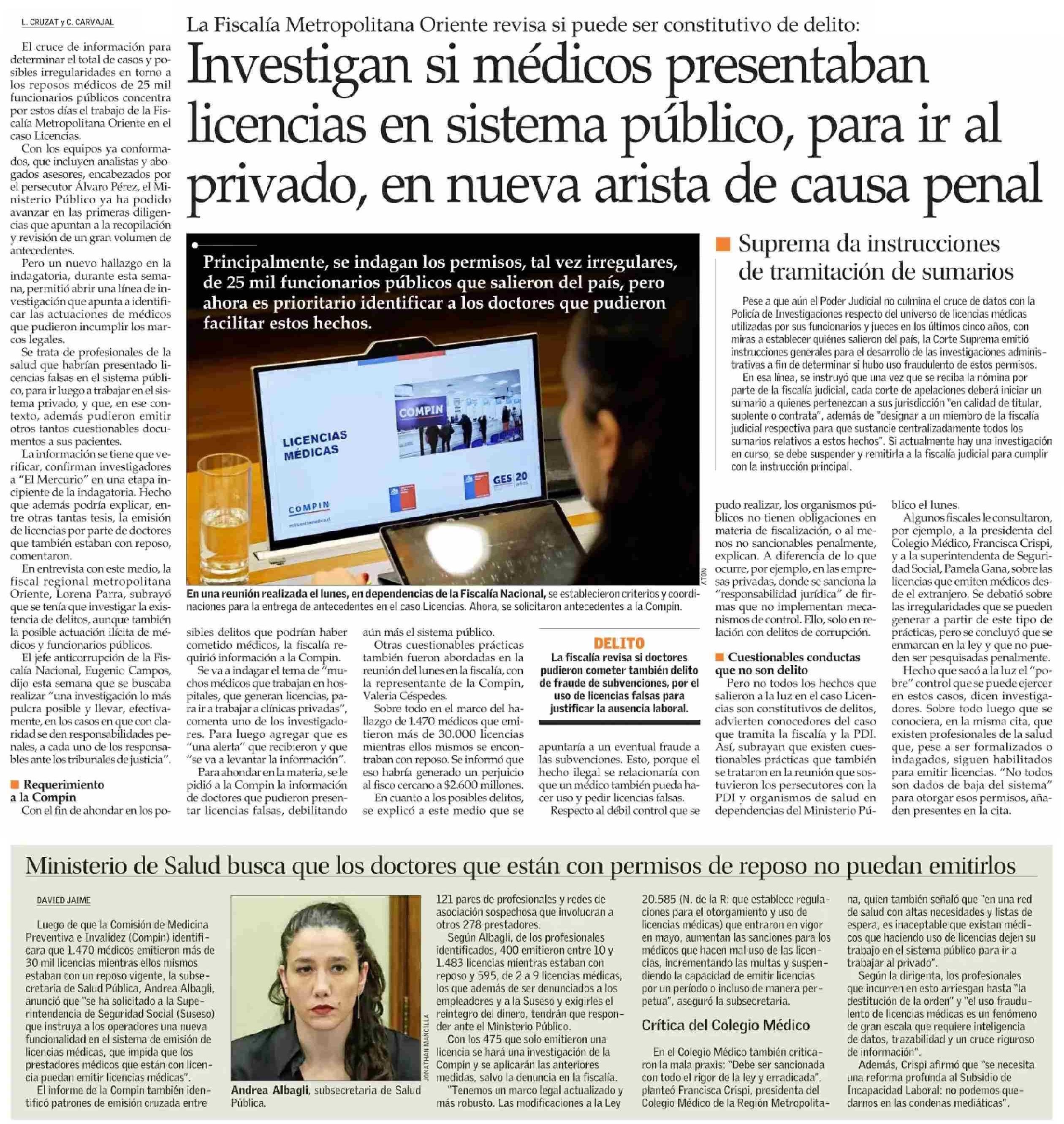 Investigan si médicos presentaban licencias en sistema público, para ir al privado, en nueva arista de causa penal 14-06-2025 El Mercurio |