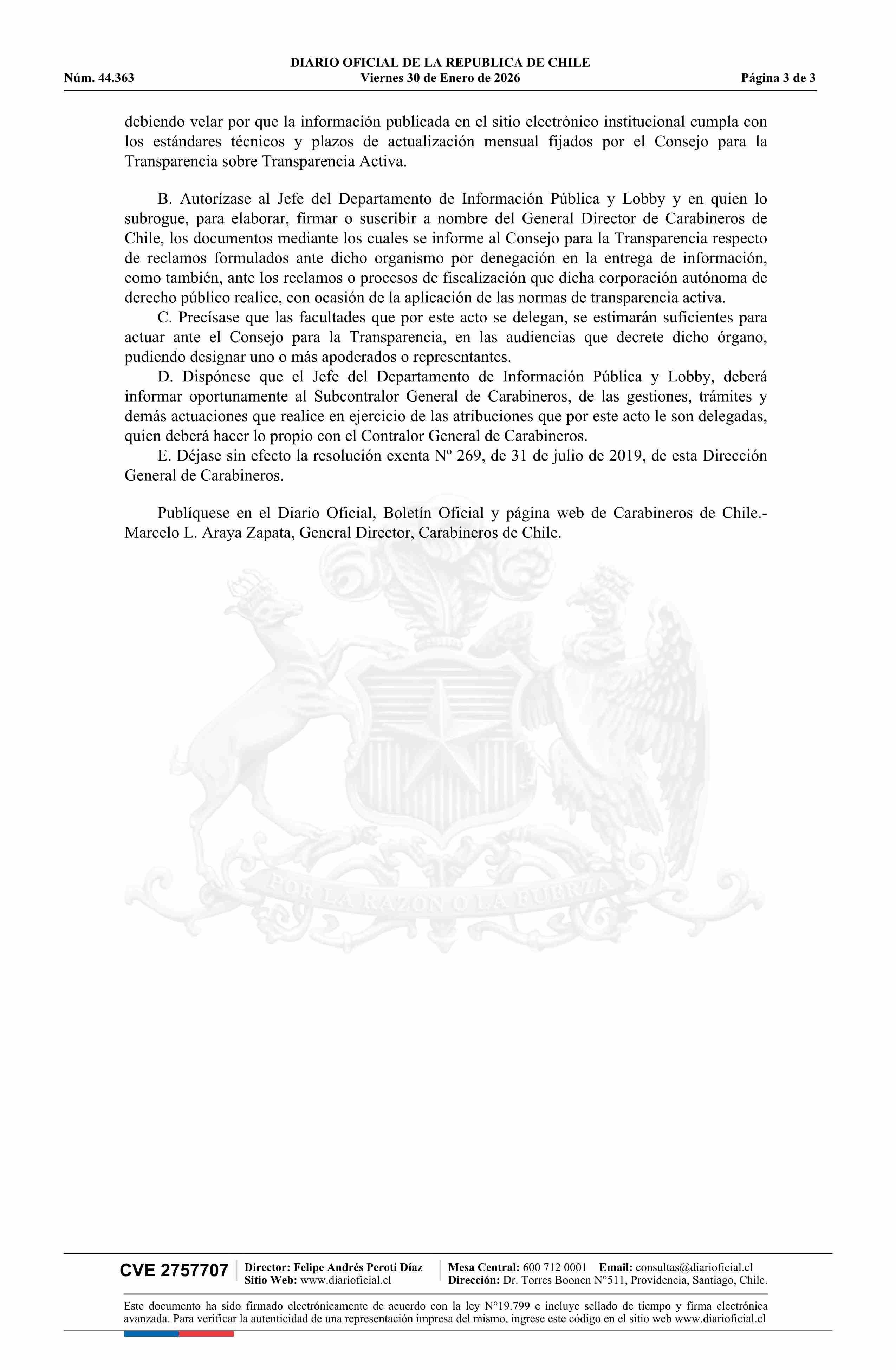 Resolución exenta número 12, de 2026.- Delega facultades que indica en el Jefe del Departamento de Información Pública y Lobby y deja sin efecto acto administrativo que indica 30-01-2026 DIARIO OFICIAL CHILE - BOLETÍN OFICIAL DE MINERÍA |