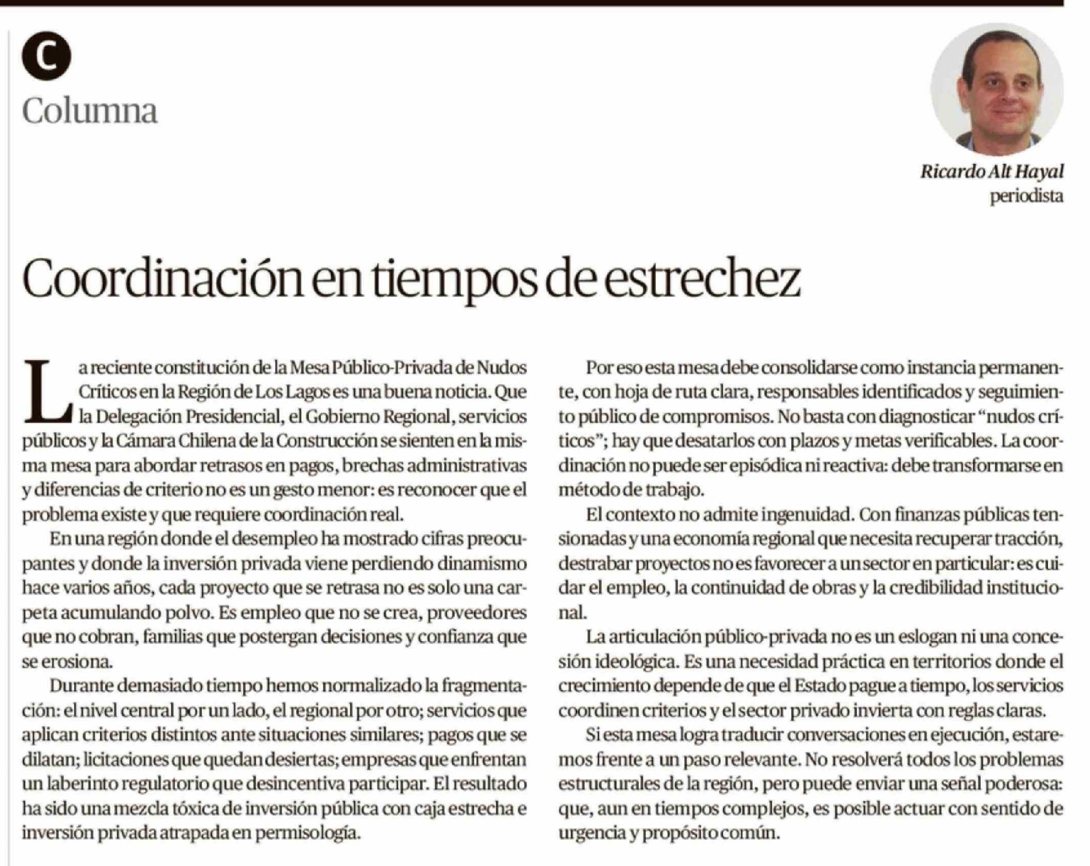 Columnas de Opinión: Coordinación en tiempos de estrechez 04-03-2026 El Austral de Osorno |
