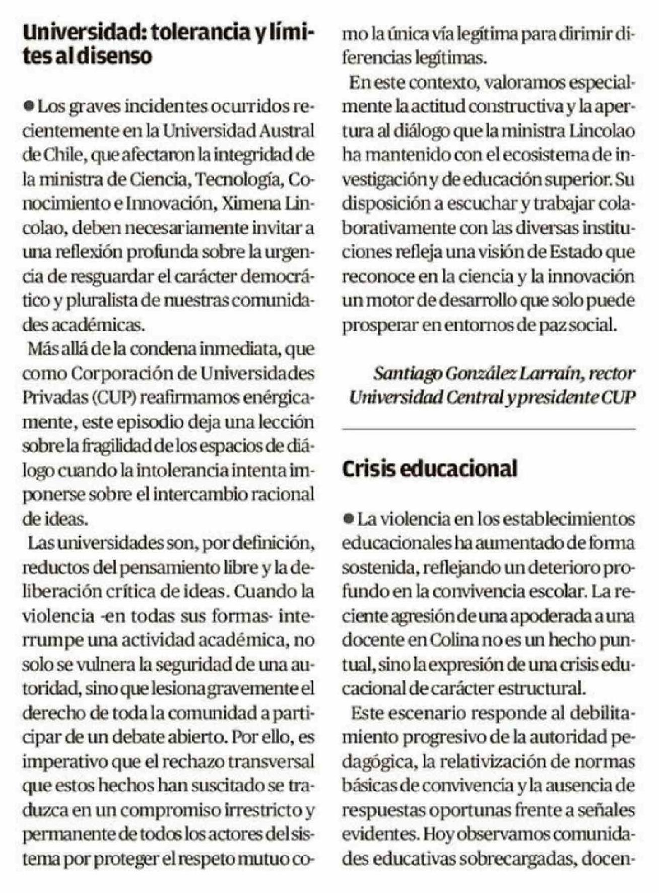 Cartas: Universidad: tolerancia y limites al disenso 21-04-2026 El Austral de la Araucanía |