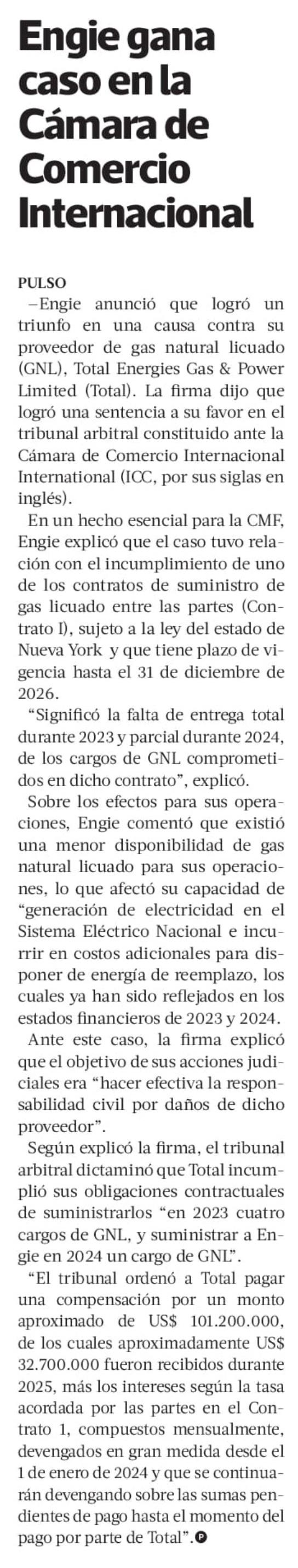 Engie gana caso en la Cámara de Comercio Internacional 19-06-2025 La Tercera |