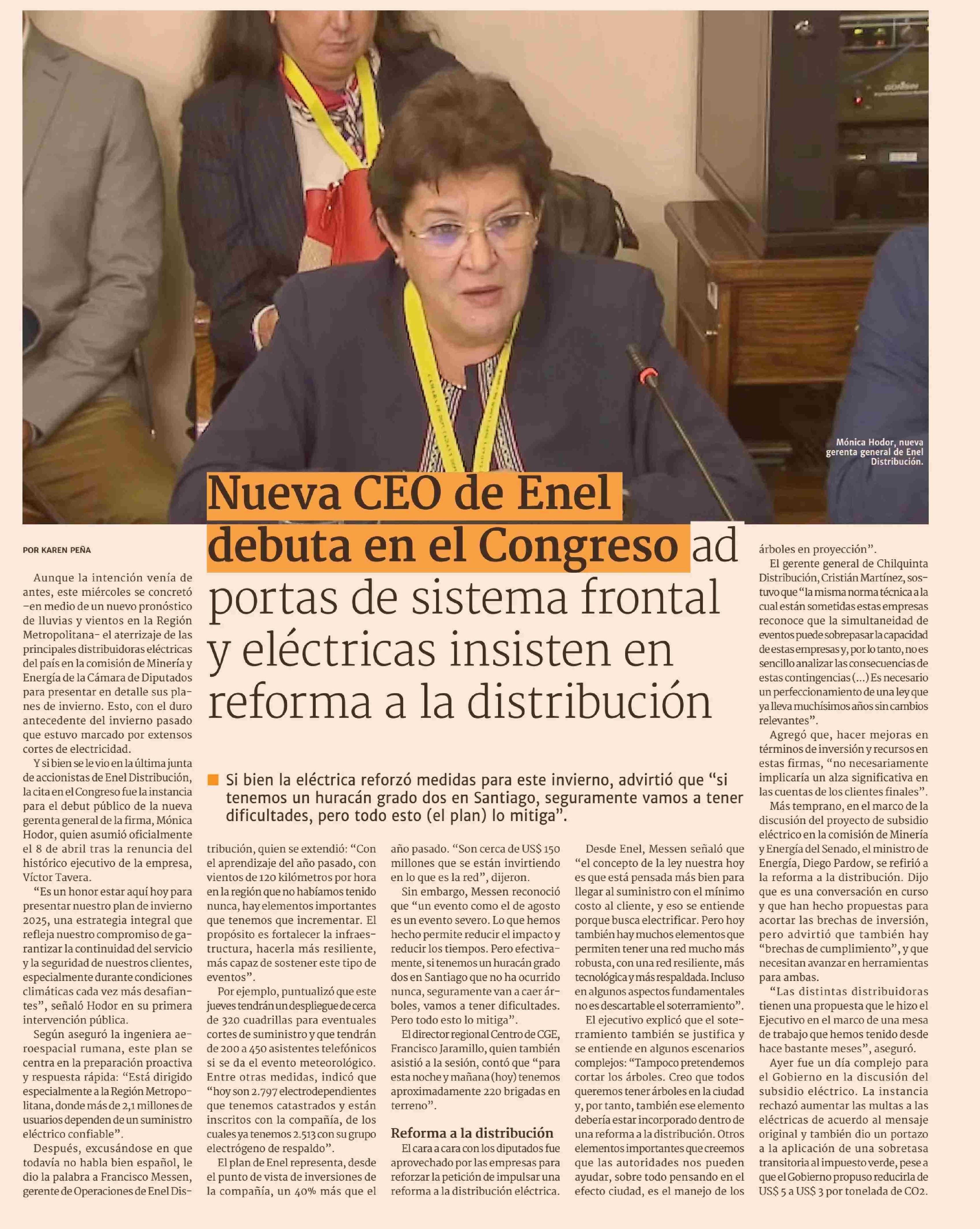 Nueva CEO de Enel debuta en el Congreso ad portas de sistema frontal y eléctricas insisten en reforma a la distribución 12-06-2025 Diario Financiero |