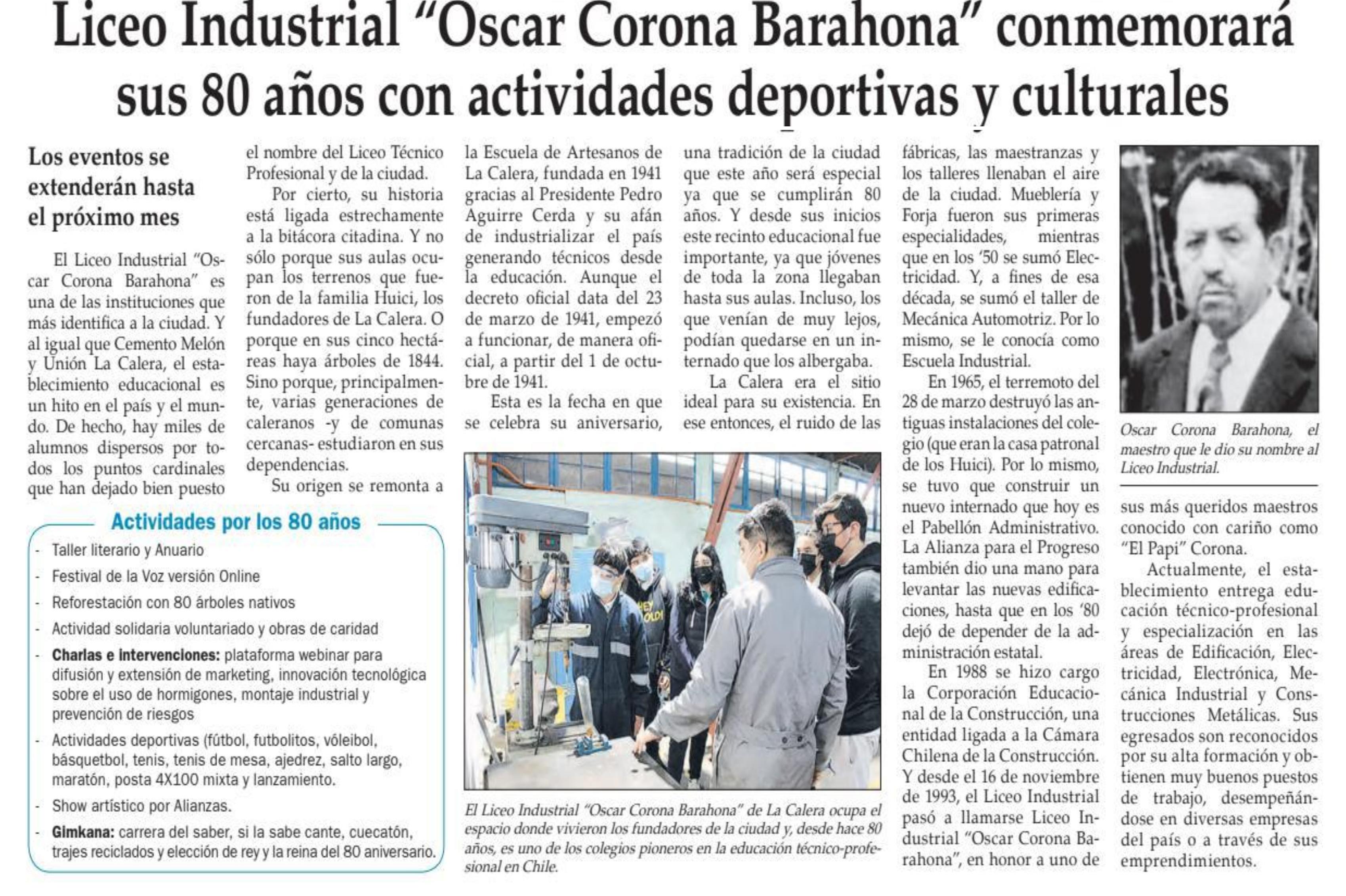 Liceo Industrial “Oscar Corona Barahona” conmemorará sus 80 años con actividades deportivas y culturales 24-09-2021 El Observador |
