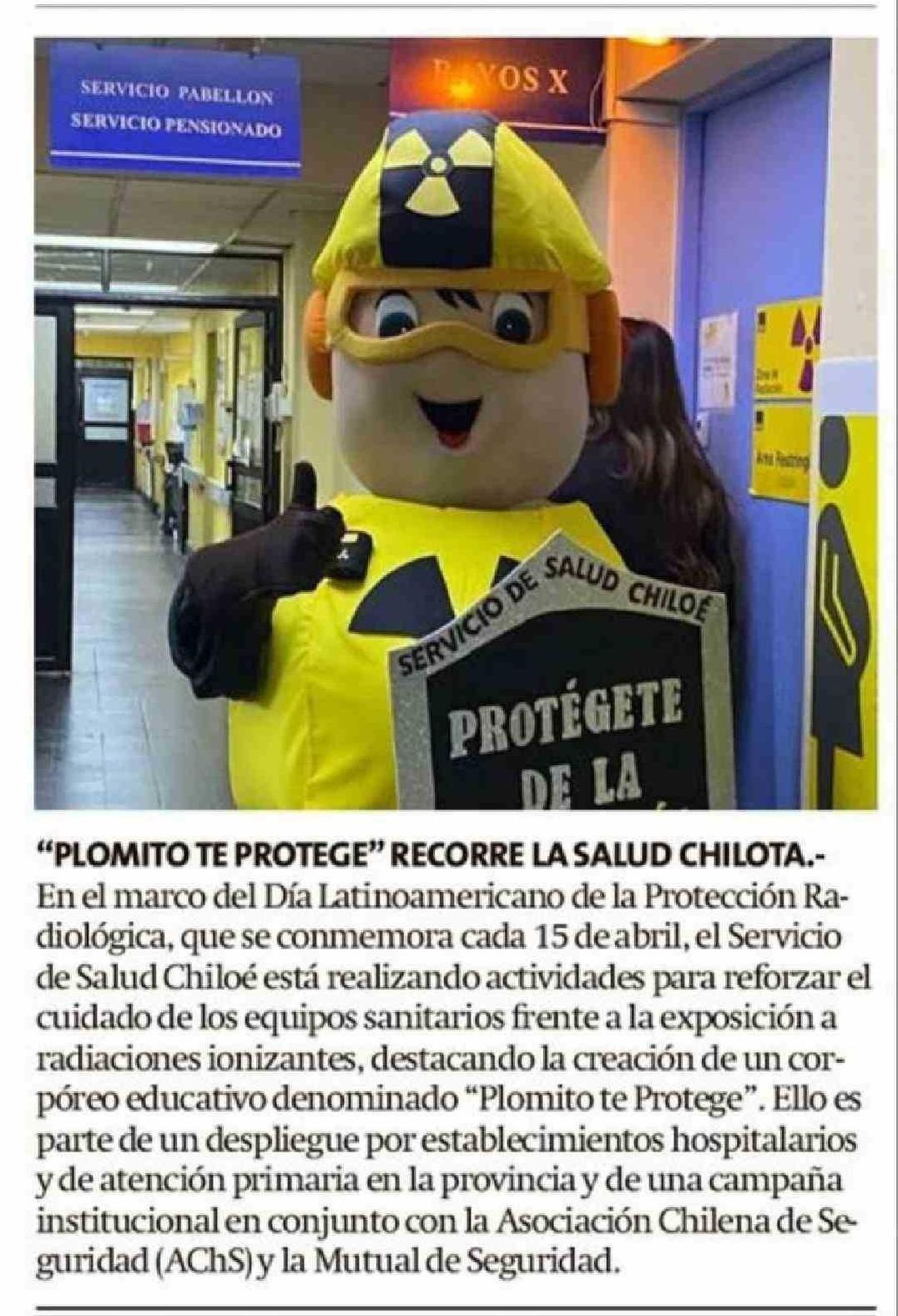 | Título: | "PLOMITO TE PROTEGE" RECORRE LA SALUD CHILOTA .En el marco del Día Latinoamericano de la Protección Radiológica, que se conmemora cada 15 de abril, el Servicio de Salud Chiloé está realizando actividades para reforzar el cuidado de los equipos sanitarios frente a la exposición a radiaciones ionizant |