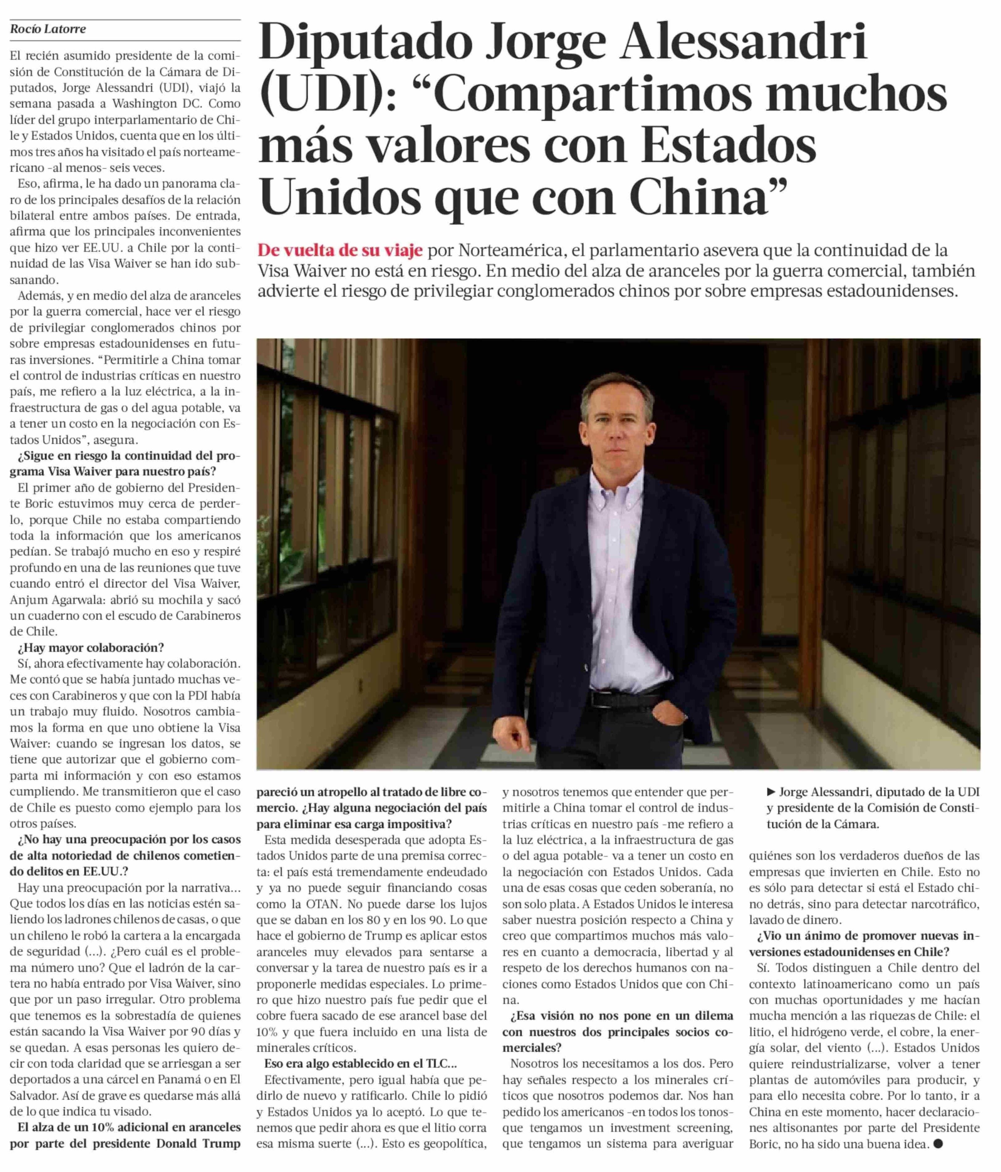 Diputado Jorge Alessandri (UDD: “Compartimos muchos más valores con Estados Unidos que con China” 15-05-2025 La Tercera |