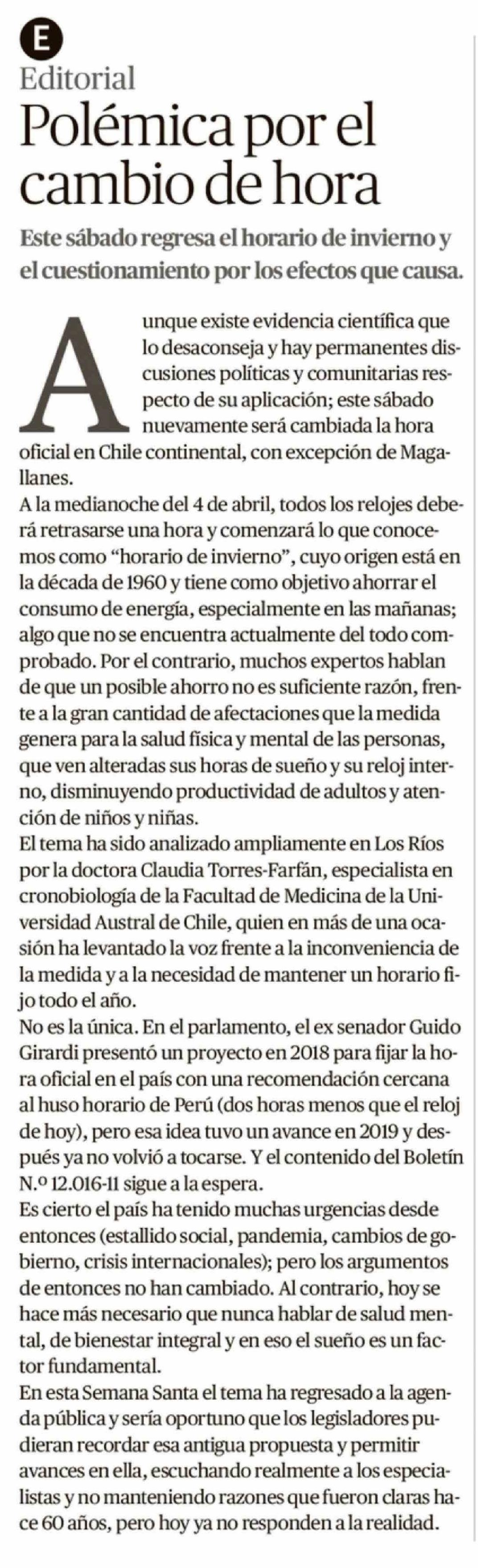 Editorial: Polémica por el cambio de hora 02-04-2026 Diario Austral Región de Los Ríos |