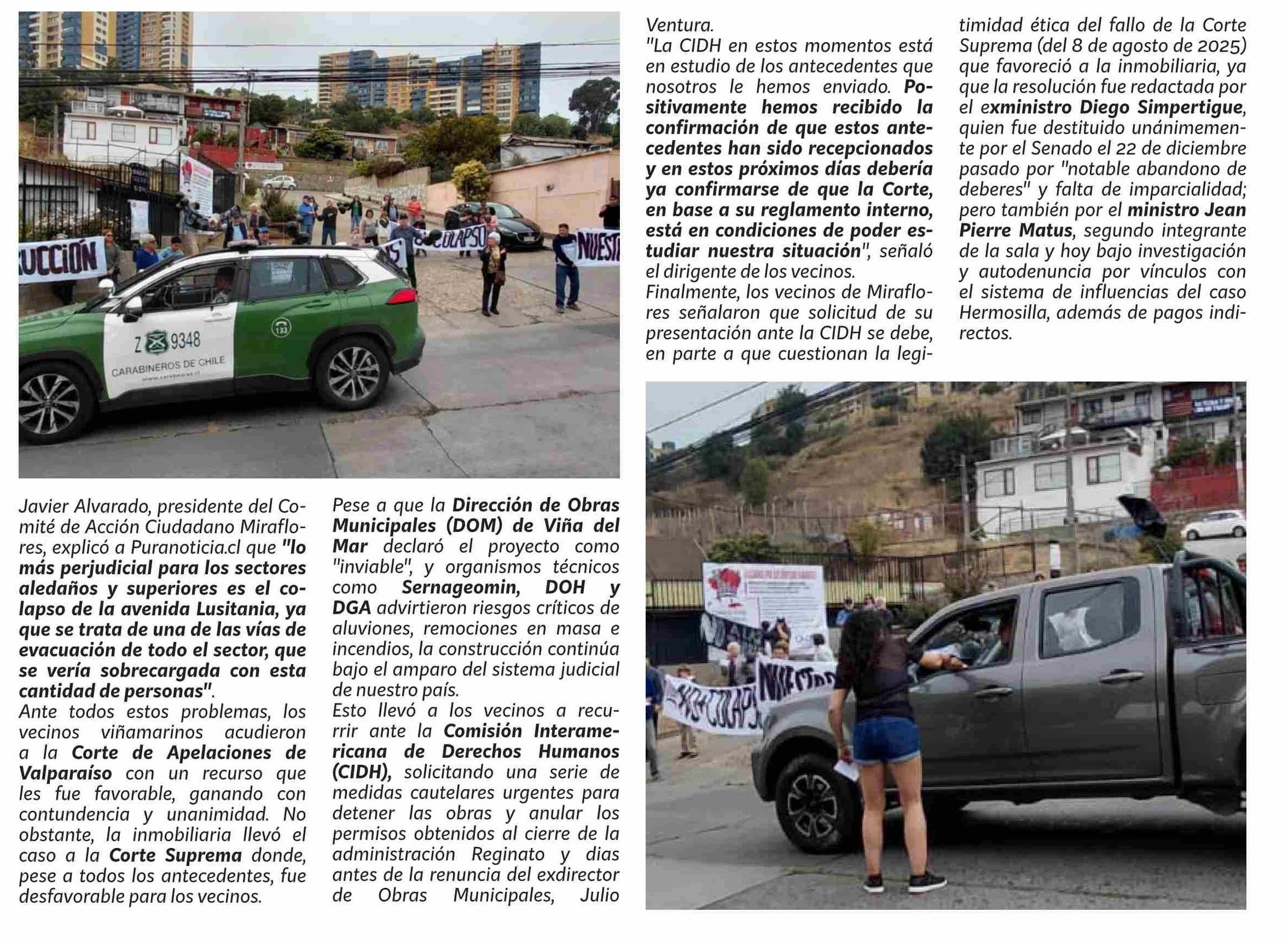 Viñamarinos en pie de guerra con proyecto inmobiliario: se manifestaron y acudieron a Comisión Interamericana de DD.HH. 12-01-2026 Puranoticia.cl |