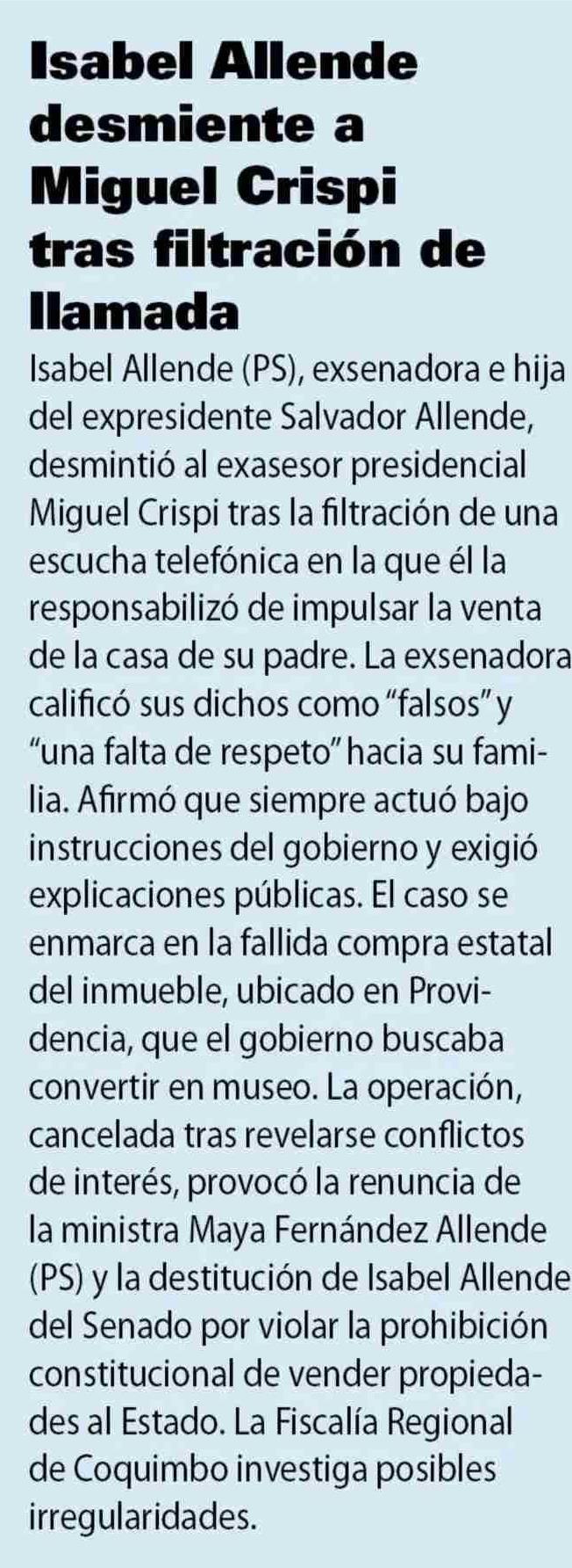 Isabel Allende desmiente a Miguel Crispi llamada tras filtración de 27-04-2025 Las Últimas Noticias |