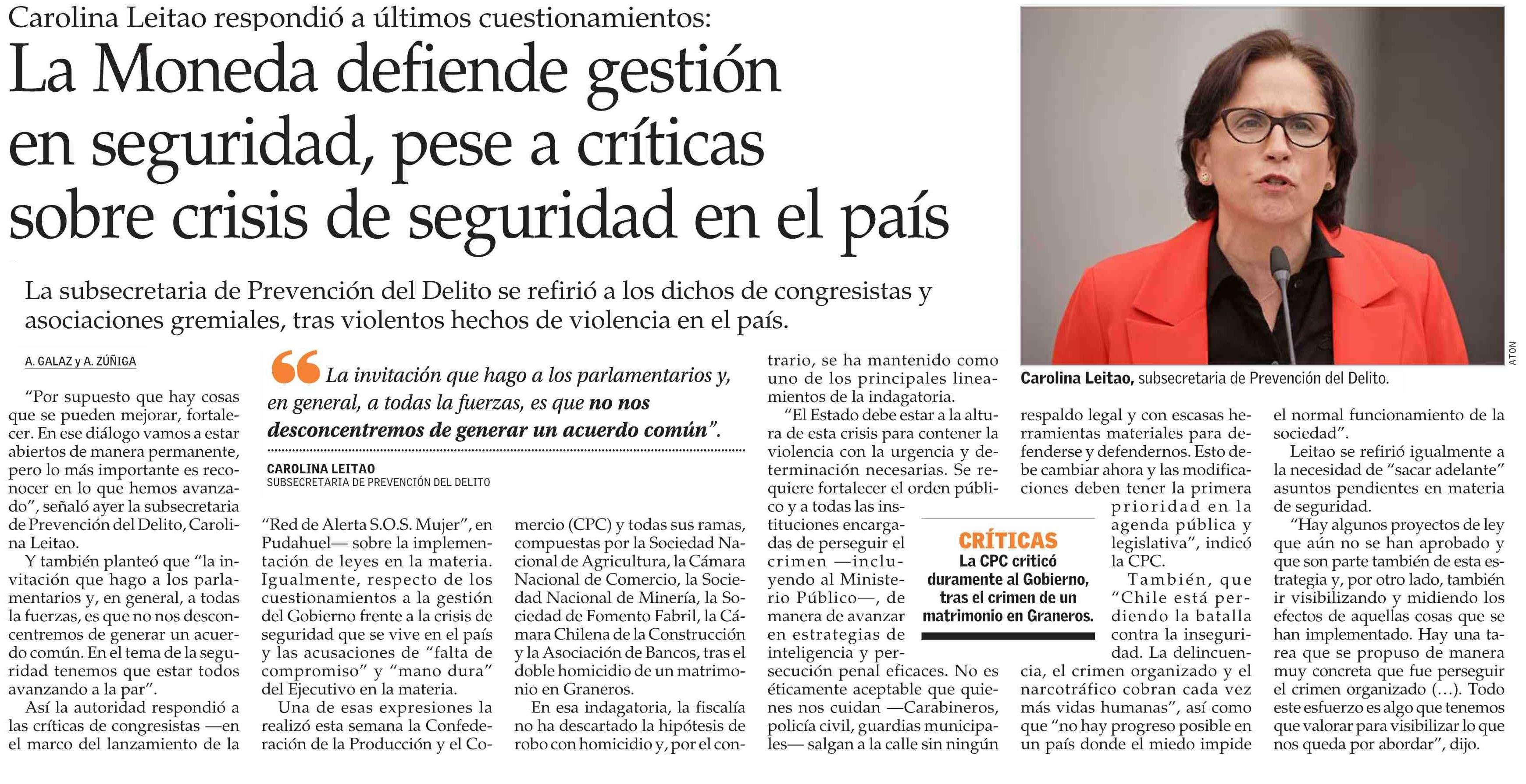 | Título: | La Moneda defiende gestión en seguridad, pese a críticas sobre crisis de seguridad en el país |