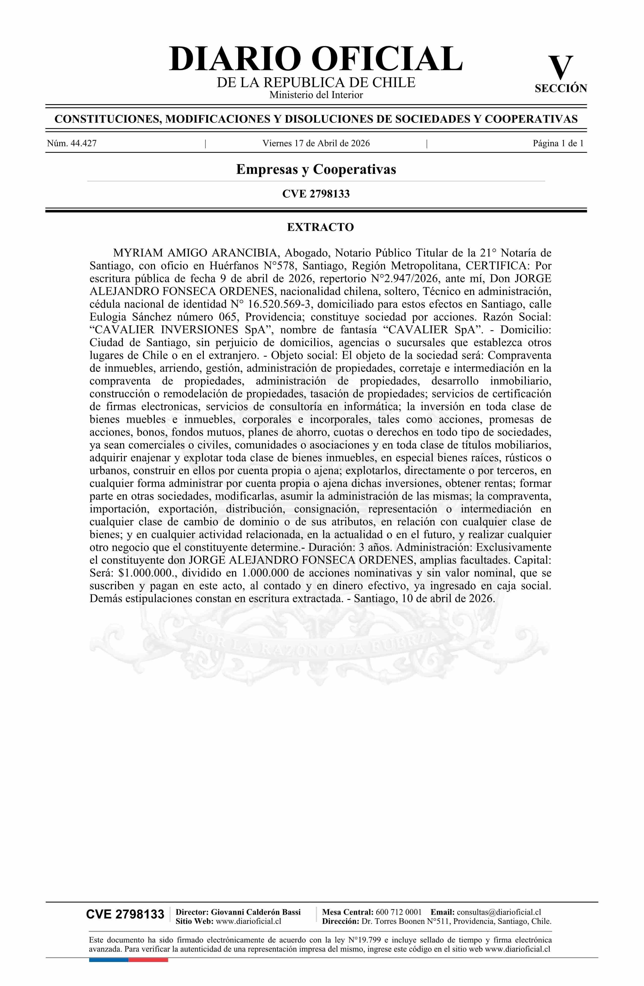 CAVALIER INVERSIONES SpA 17-04-2026 Diario Oficial Edición Electrónica |