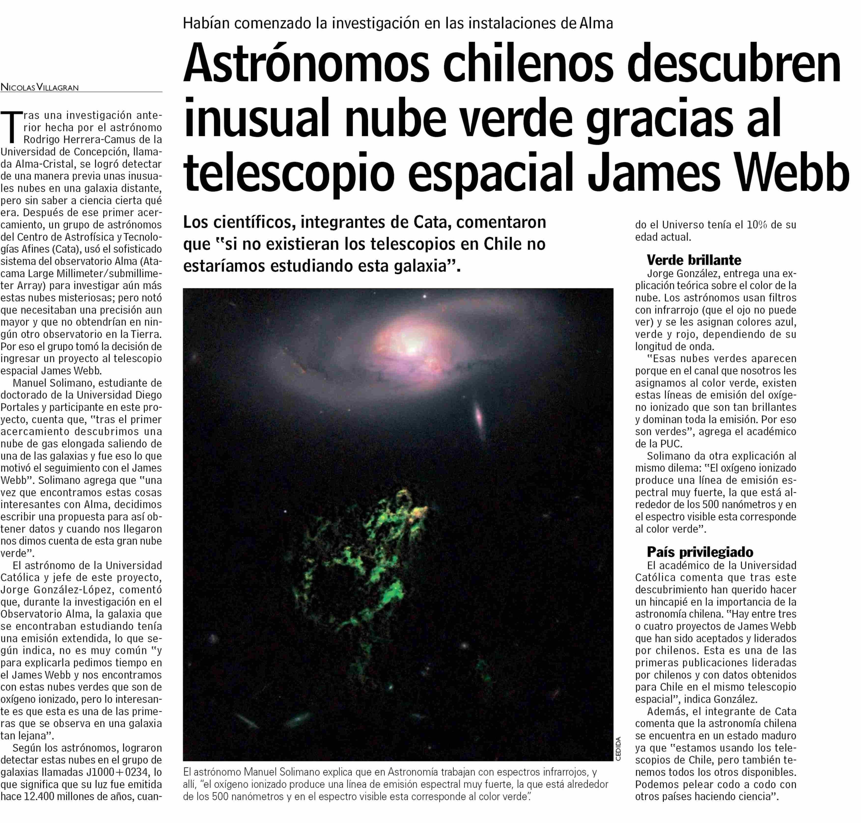 | Título: | Astrónomos chilenos descubren inusual nube verde gracias al telescopio espacial James Webb |