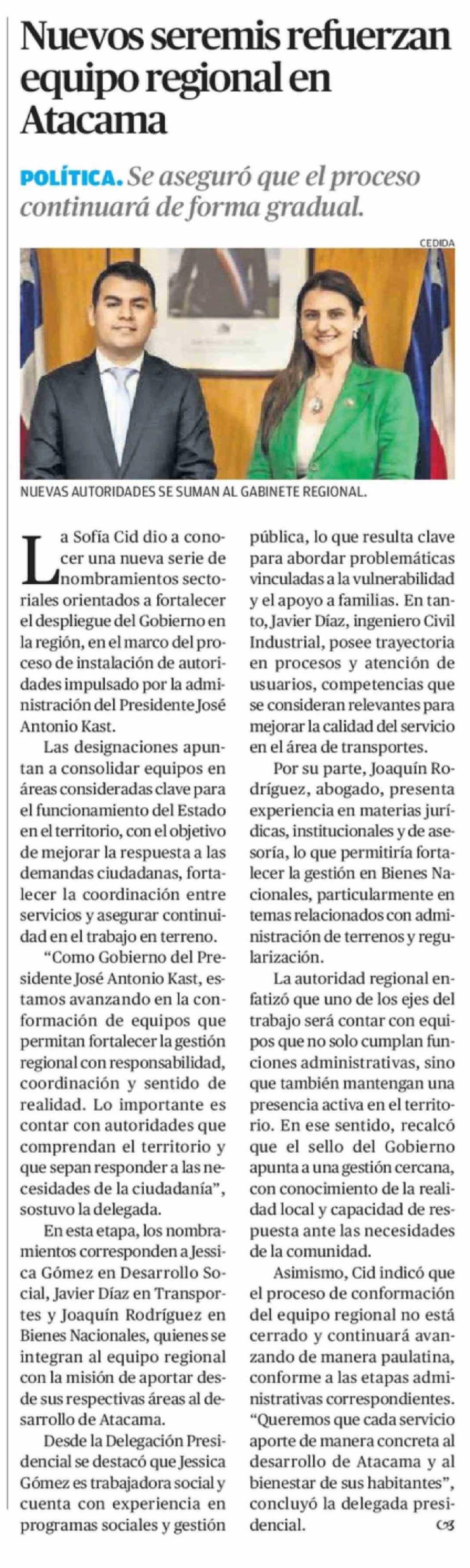 Nuevos seremis refuerzan equipo regional en Atacama 28-03-2026 El Diario de Atacama |