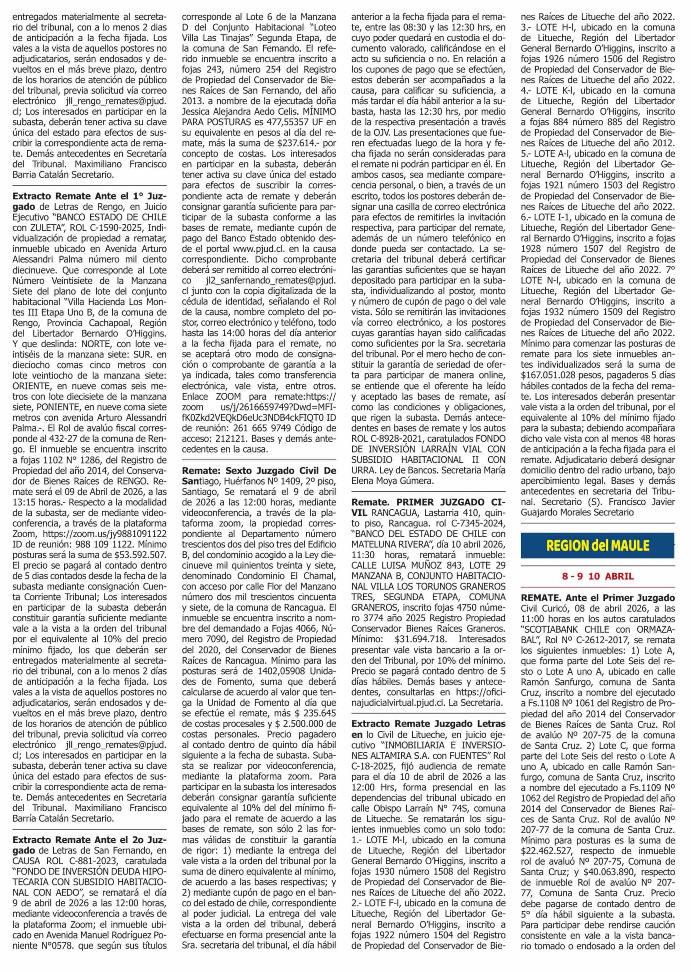 Remates: REMATES de PROPIEDADES (ORDENADOS por REGIONES) 02-04-2026 P&L Públicos y Legales |
