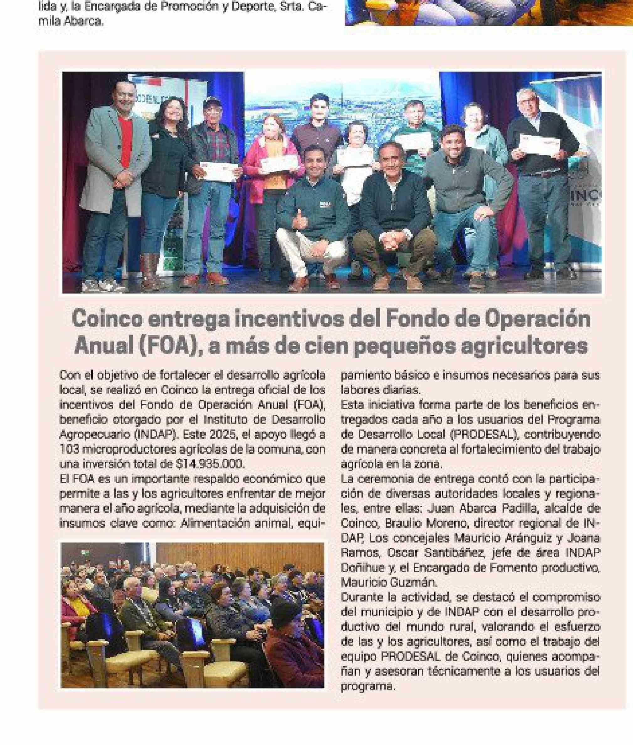Coinco entrega incentivos del Fondo de Operación Anual (FOA), a más de cien pequeños agricultores 20-05-2025 El Rancagüino |