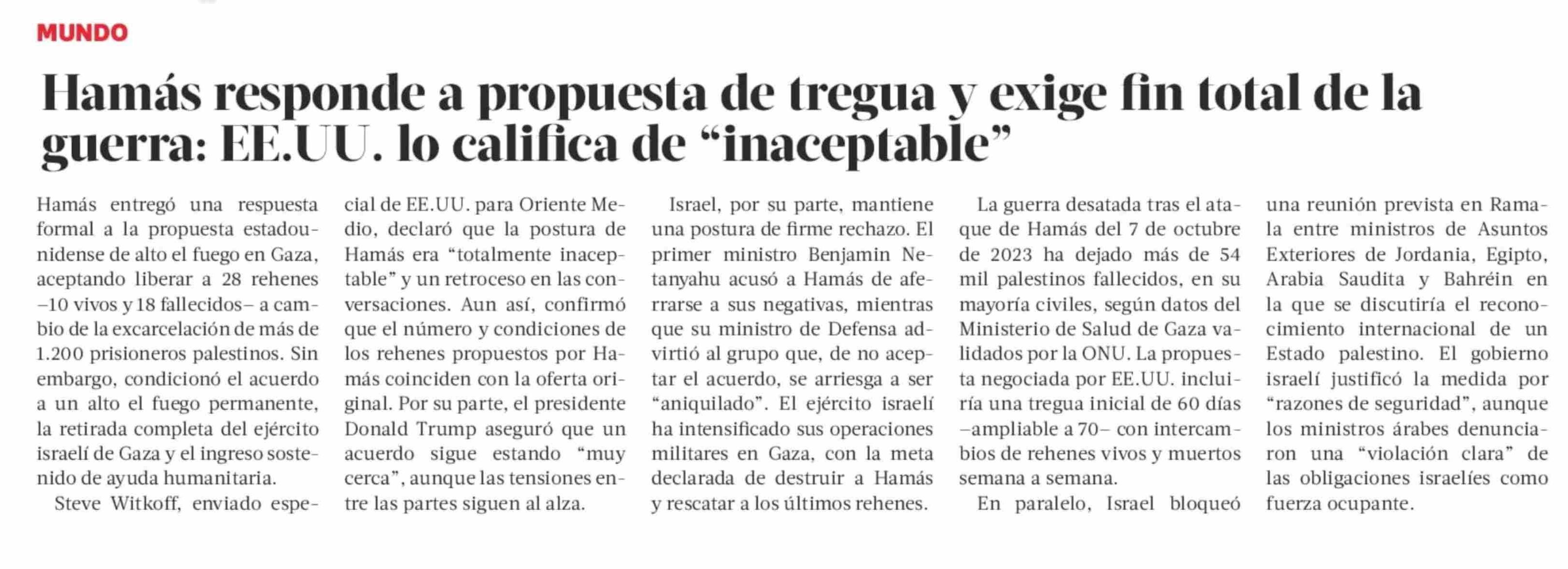 Título: Hamás responde a propuesta de tregua y exige fin total de la guerra: EE.UU. lo califica de “inaceptable”