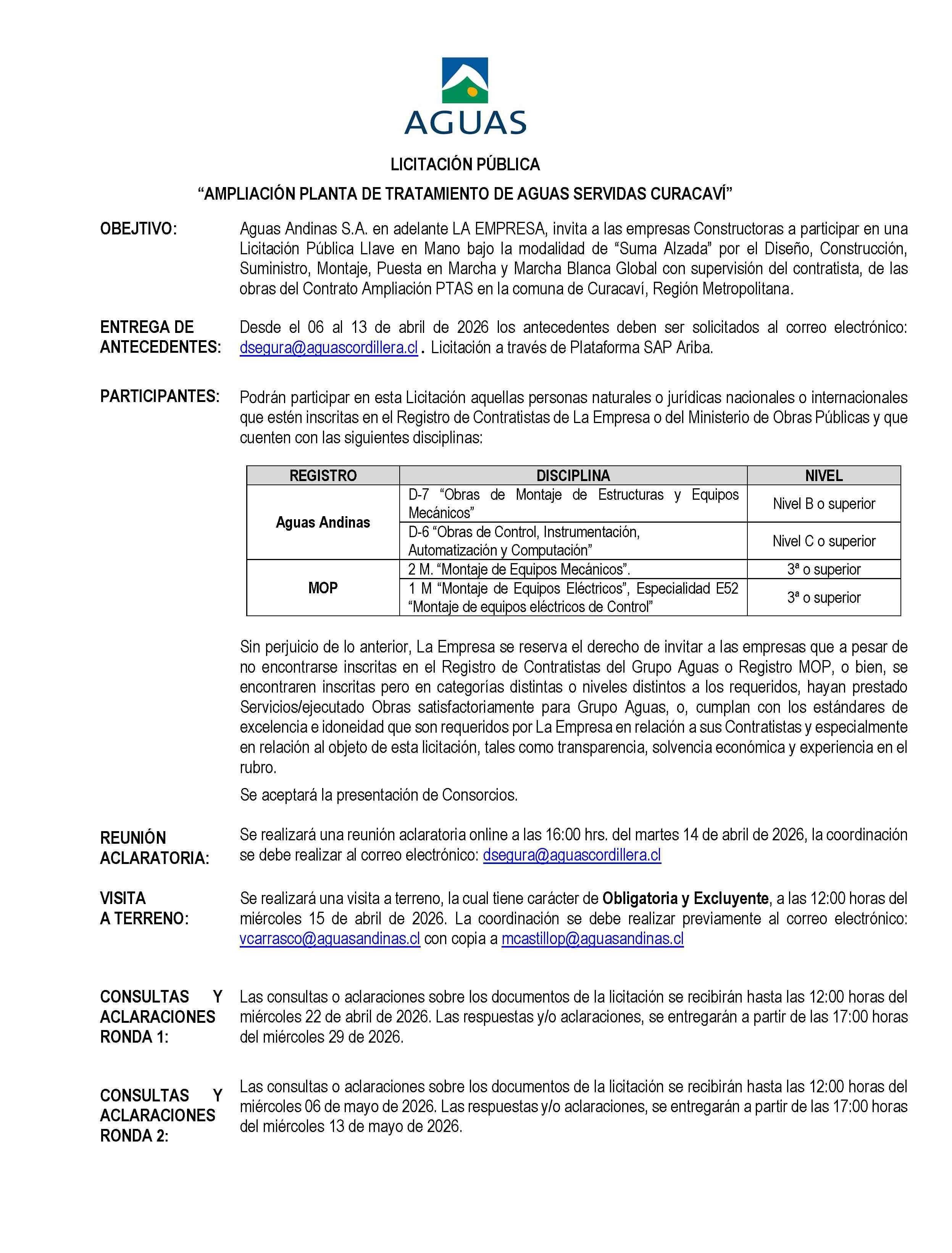 AVISO LICITACIONES: “AMPLIACIÓN PLANTA DE TRATAMIENTO DE AGUAS SERVIDAS CURACAVÍ”