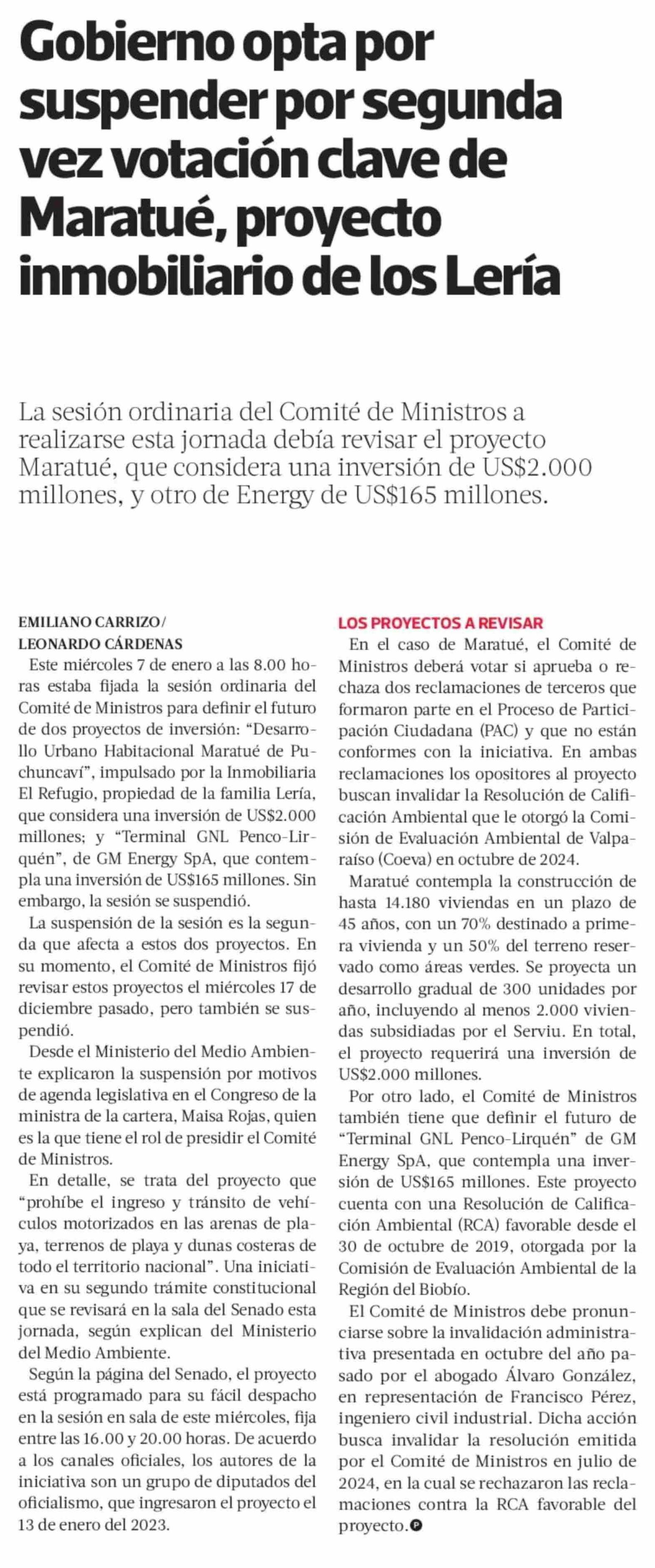 Gobierno opta por suspender por segunda vez votación clave de Maratué, proyecto inmobiliario de los Lería 08-01-2026 La Tercera |