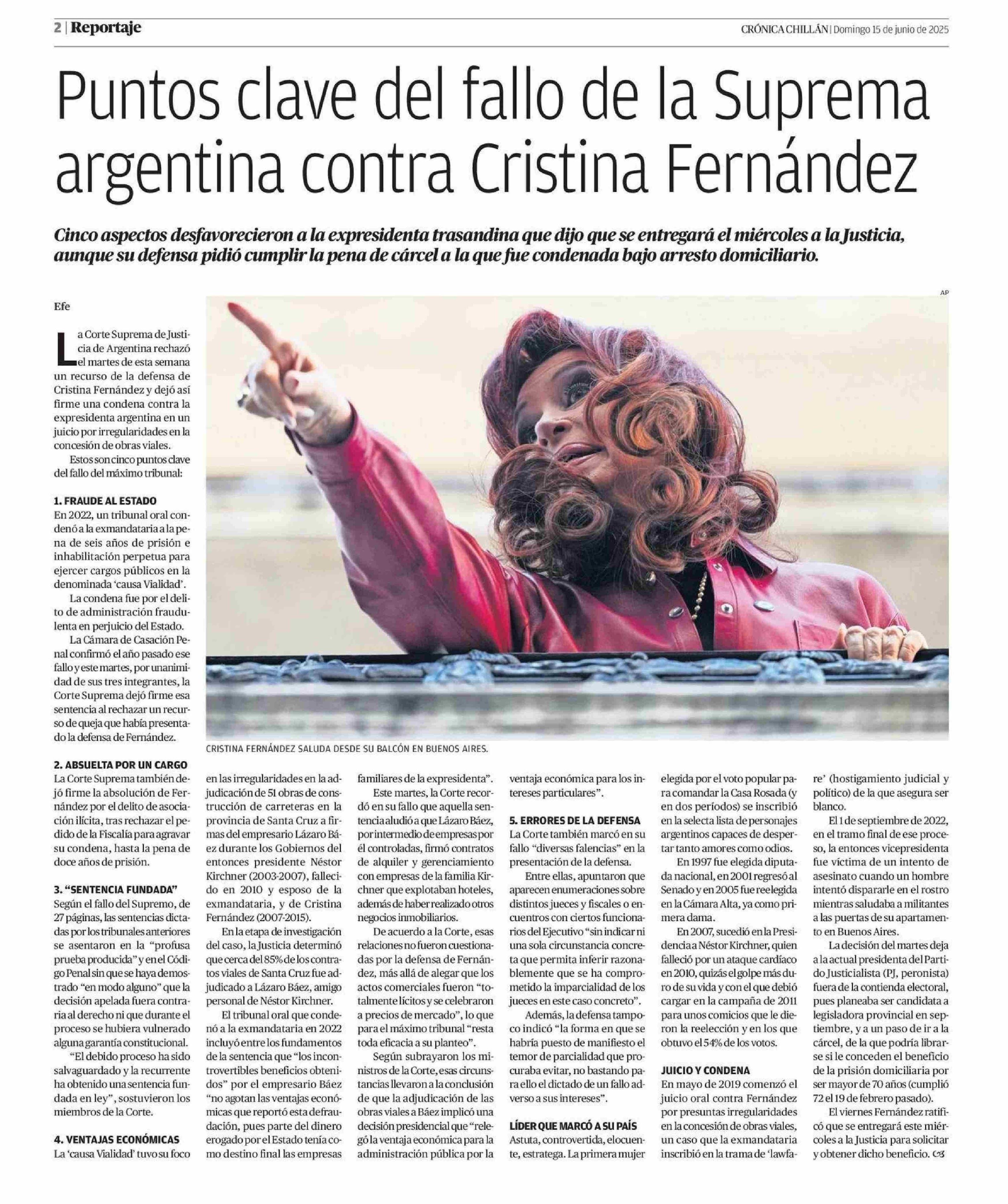 Puntos clave del fallo de 1 a Suprema argentína contra Cristina Fernández 15-06-2025 Crónica de Chillán |
