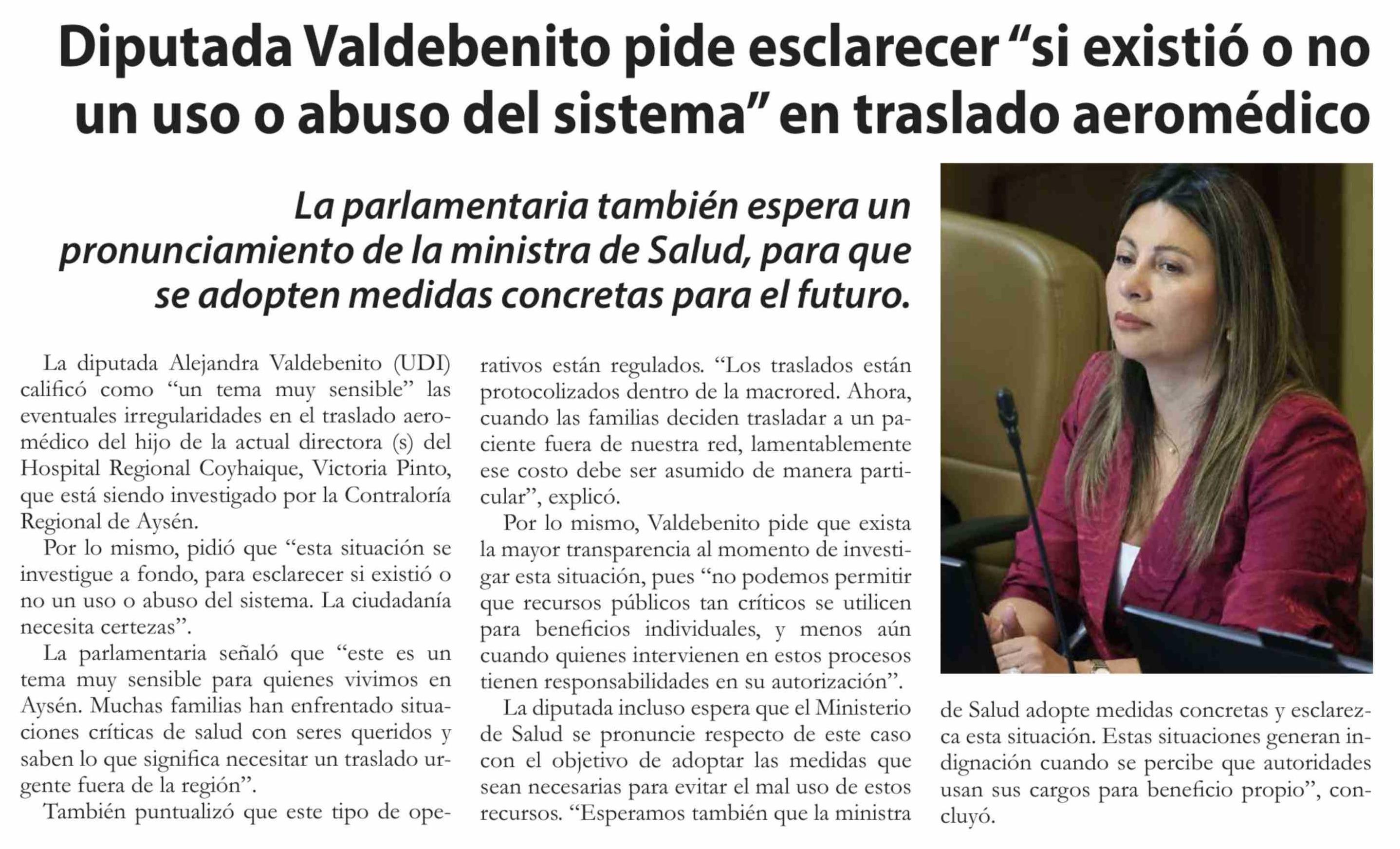 Título: Diputada Valdebenito pide esclarecer "si existió o no un uso o abuso del sistema" en traslado aeromédico