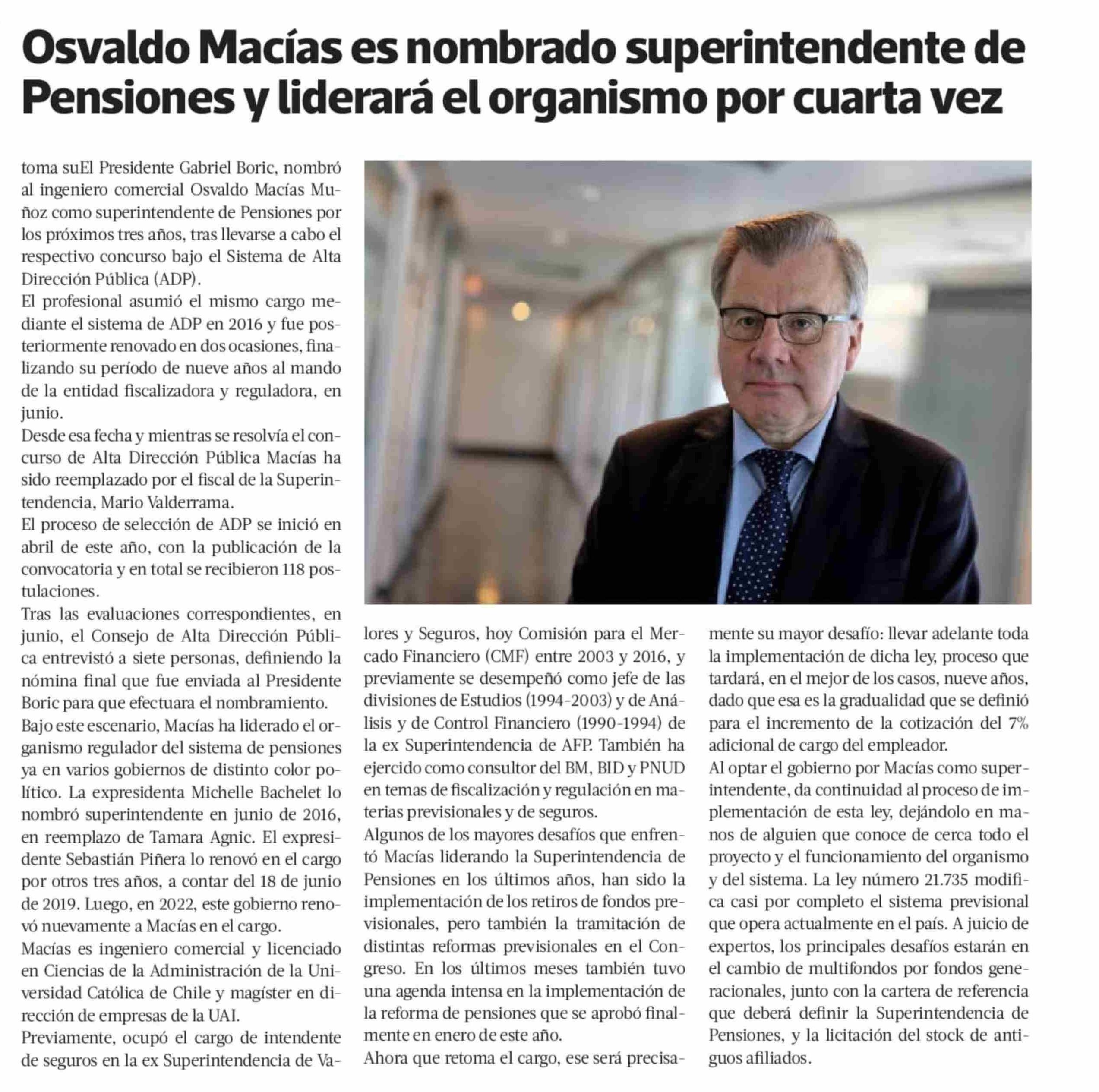 Osvaldo Macías es nombrado superintendente de Pensiones y liderará el organismo por cuarta vez 23-07-2025 La Tercera |