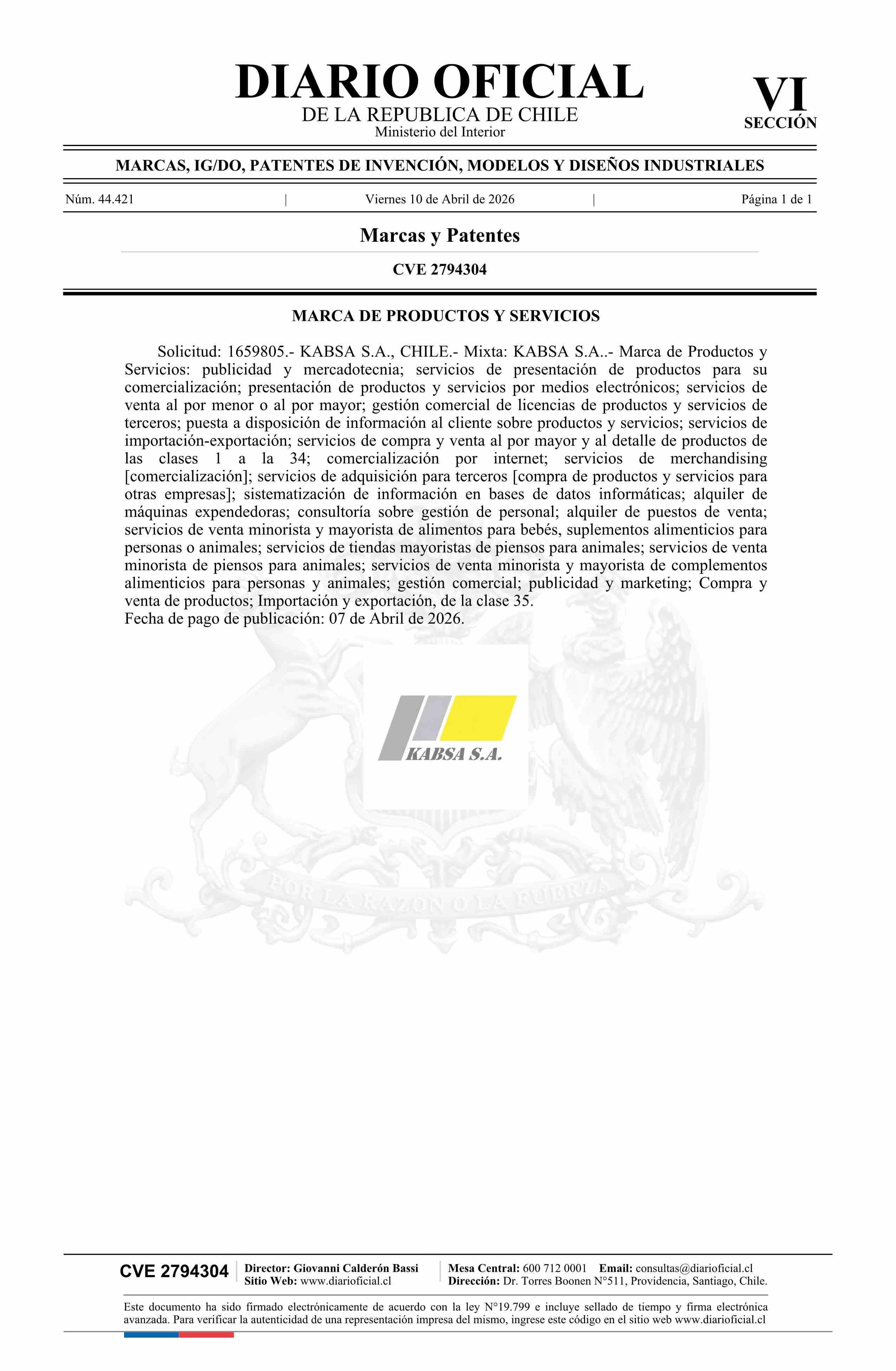 Solicitud número 1659805.- KABSA S.A. 10-04-2026 Diario Oficial Edición Electrónica |