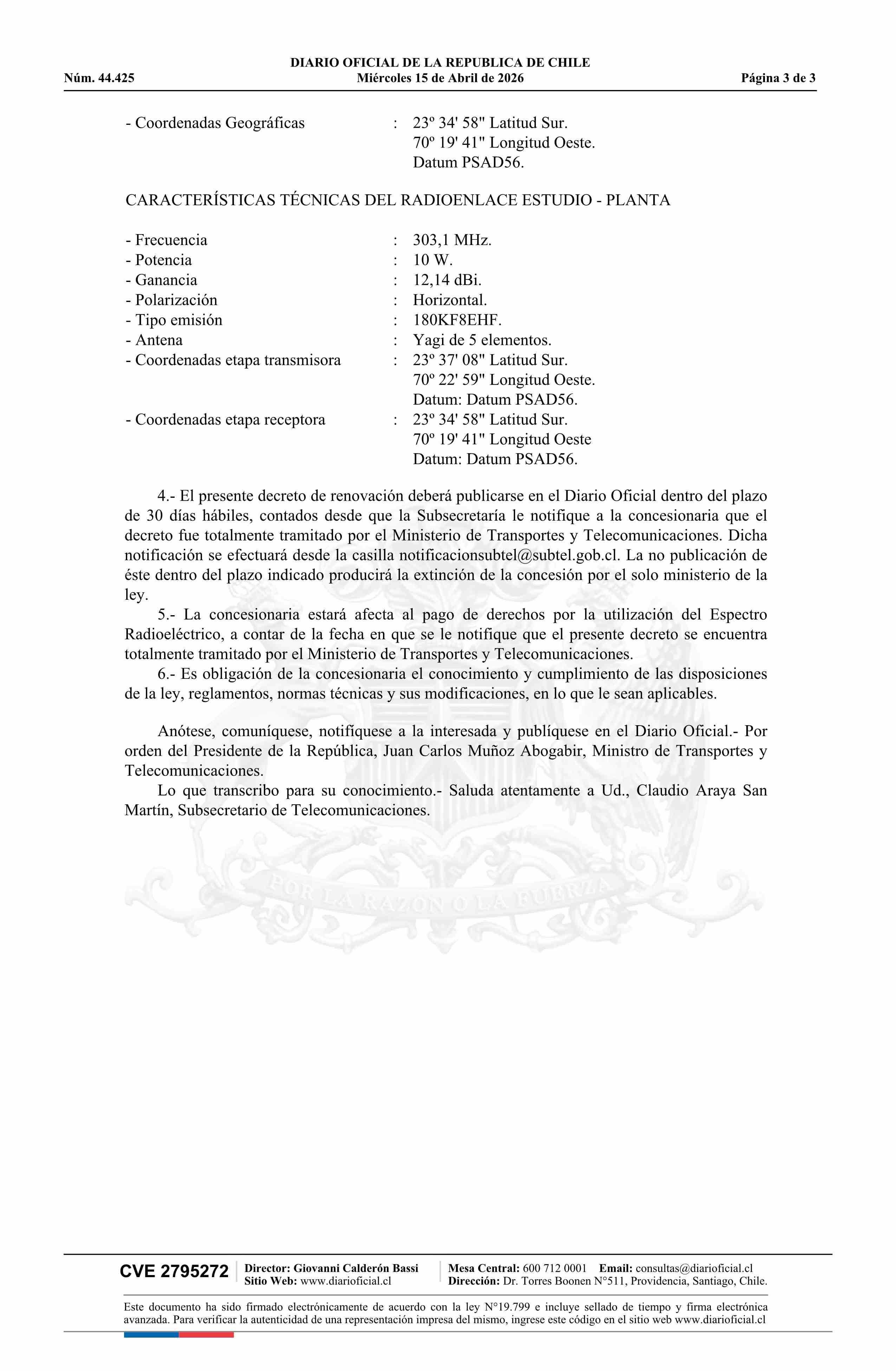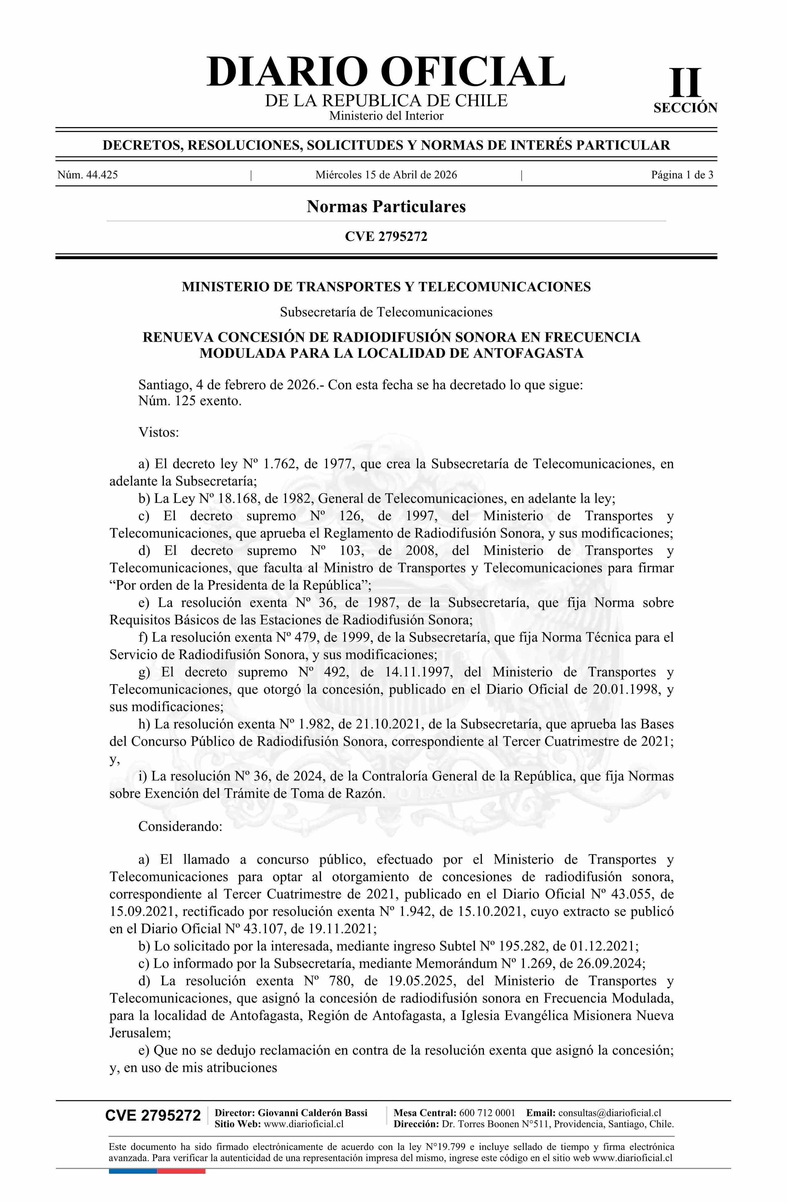 Decreto exento número 125, de 2026.- Renueva concesión de radiodifusión sonora en frecuencia modulada para la localidad de Antofagasta 15-04-2026 Diario Oficial Edición Electrónica |